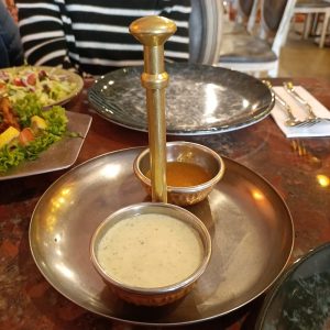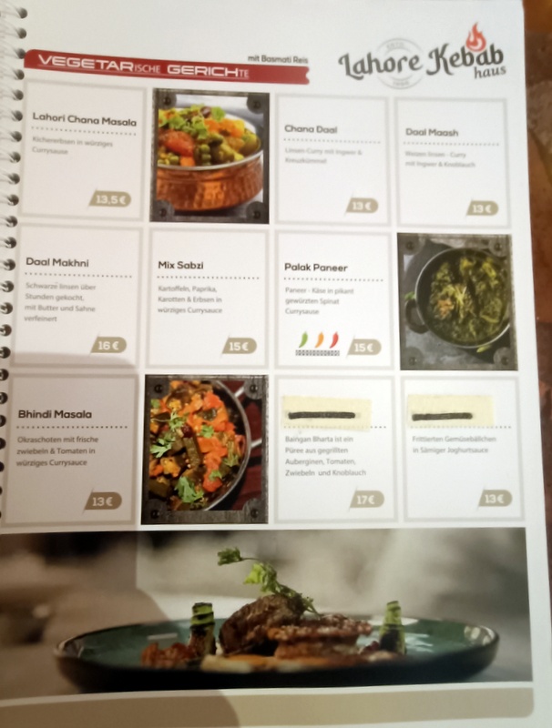 Marg was swithering between Samosa Chat (€9.50) and Veg Pakora (€7.50). She was certain that Salad was required. Lahori Kahumber Salat (€9.50) was a consideration. Simpler Salads were displayed on the menu, however, on my version, some had been scored out. The full menu appears, eventually, at the foot of this post. The waitress advised, that Salad would come – Kostenlos, maintaining the great German tradition of serving a Side Salad with every meal. Pakora it would be, sorted.