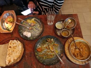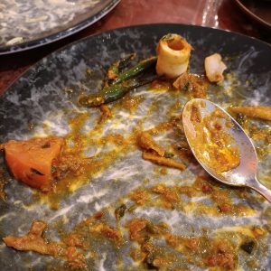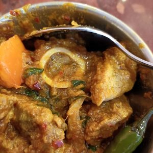 The first dip of the Naan in the yellow Masala surprised. Creamy yes, perhaps a hint of Coconut Milk in there, but this was not the standard Korma served up across the planet. There was a good – kick – medium plus had been achieved. The Seasoning was spot on, a seriously flavoursome Curry. The Meat count reached double figures, what’s more, some were on-the-bone.