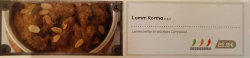 With minimal English from our server, and minimal Deutsch on my part, I did my best to establish that this Curry was in fact the Desi Qorma, not the bland Creamy-Coconut interpretation that is eschewed in these pages. An above medium Spice Level was sought, medium-plus – was my attempt. At this point I became worried that the waitress was recording two Lamm Kormas. She insisted otherwise.