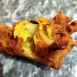 Eight large pieces of Pakora sat on the platter, the garnish included a whole Green Chilli. Marg would not be having that.