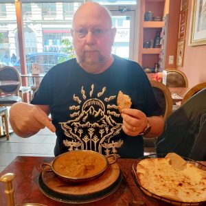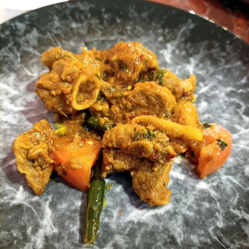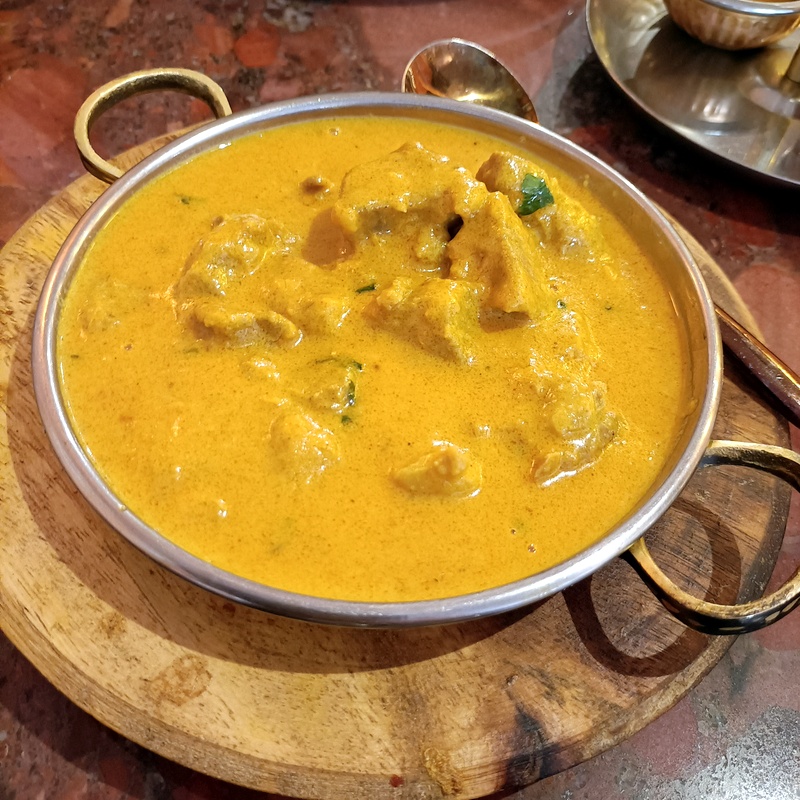 The first dip of the Naan in the yellow Masala surprised. Creamy yes, perhaps a hint of Coconut Milk in there, but this was not the standard Korma served up across the planet. There was a good – kick – medium plus had been achieved. The Seasoning was spot on, a seriously flavoursome Curry. The Meat count reached double figures, what’s more, some were on-the-bone.