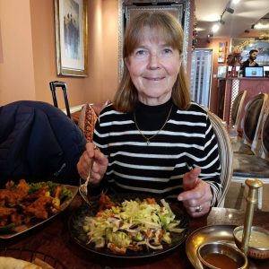 Marg was swithering between Samosa Chat (€9.50) and Veg Pakora (€7.50). She was certain that Salad was required. Lahori Kahumber Salat (€9.50) was a consideration. Simpler Salads were displayed on the menu, however, on my version, some had been scored out. The full menu appears, eventually, at the foot of this post. The waitress advised, that Salad would come – Kostenlos, maintaining the great German tradition of serving a Side Salad with every meal. Pakora it would be, sorted.