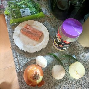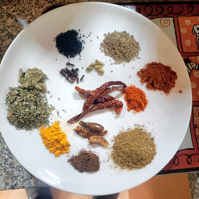 A piece of Salmon was defrosted, to be added late on in the cooking of the Curry. To start, an assembly of Spices and Herbs.