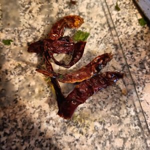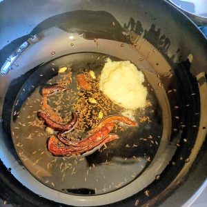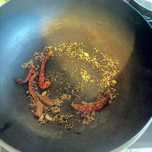 In order to create the South Indian Smokiness, whole Dry Red Chillies and Dried Prawns were dry fried along with Cloves, Cumin Seeds, Black Onion Seeds and Green Cardamom.