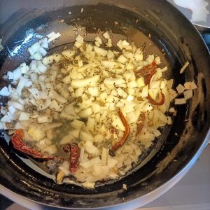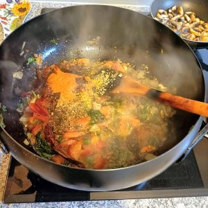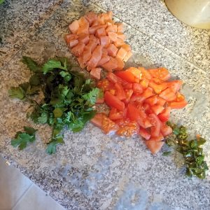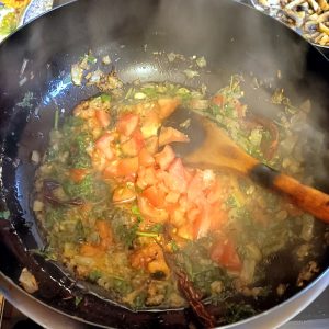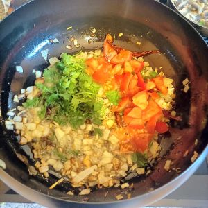 After the Onions etc. had been given a good fifteen minutes to soften, one large Tomato, sliced Green Chillies and chopped Coriander were duly added. It didn’t look right, and so a second Tomato went in.