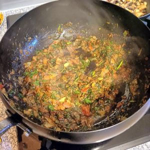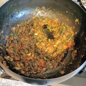Too wet, more Coriander was stirred on, followed by some more. This thickened the Masala but still too much Oil. I spooned some out.