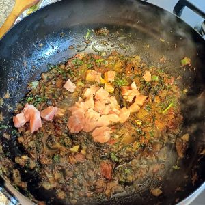The chopped Salmon was added, only a few more minutes cooking. This looked a bit miserly.