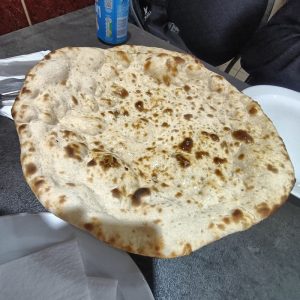 Two Naan, served whole, always a plus. With a Buttery Sheen, puffy, risen, blisters, sound. I would manage around a half, Howard a bit more.