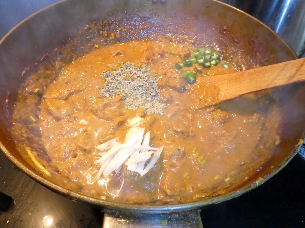 7) Add the Methi, Cummin, Fennel, chopped Green Chillies and half of the Ginger strips, cook for five minutes with lid on if happy with consistency, or lid off to reduce if necessary.
