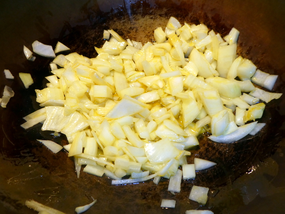 1) Heat the Oil then fry the chopped Onions until they turn translucent.