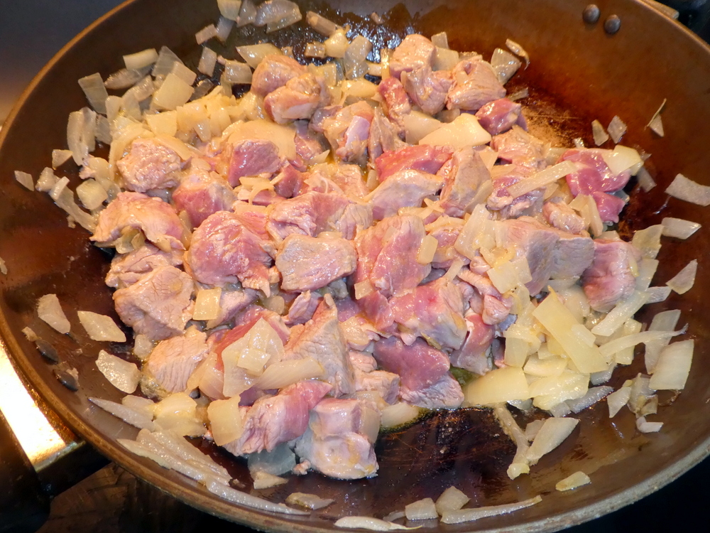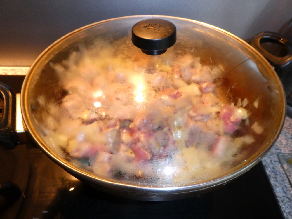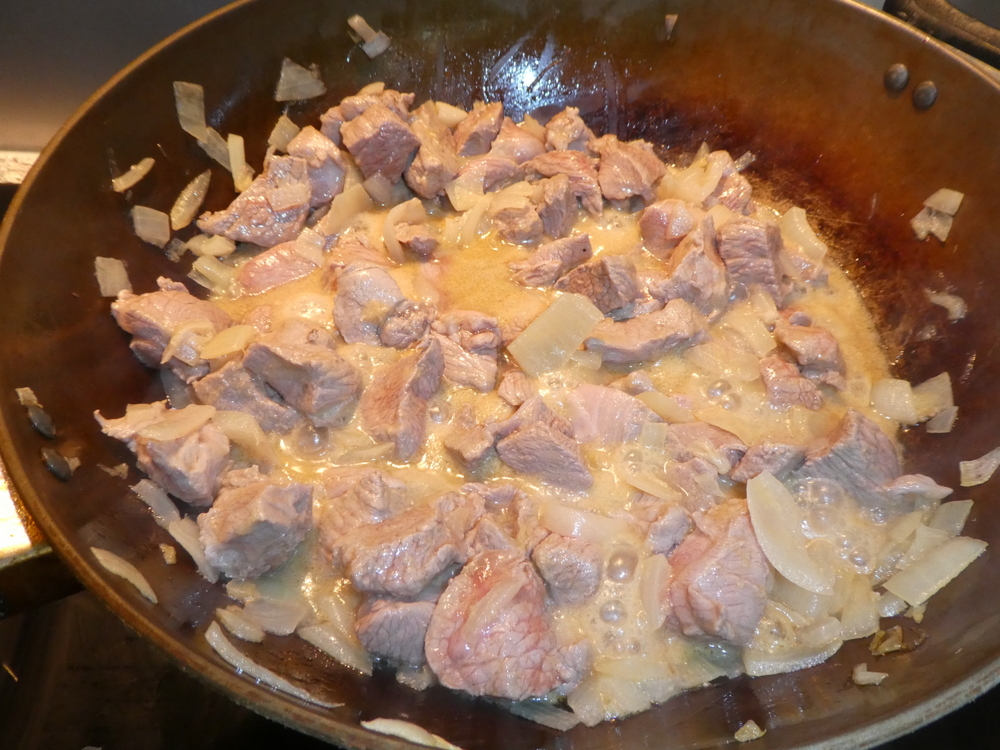 2) Stir in and brown the meat, then cook for five minutes with lid on.