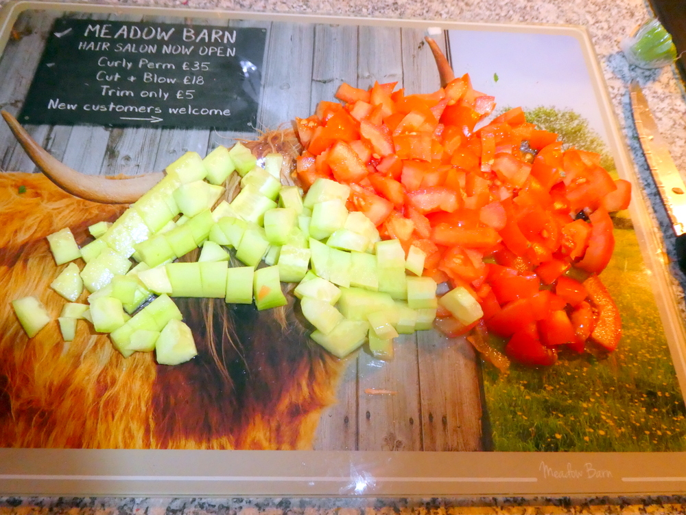 1) Finely chop the Onion, Tomatoes and Cucumber.