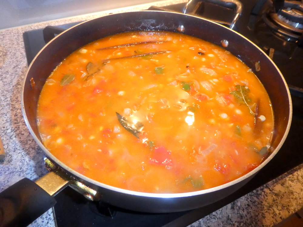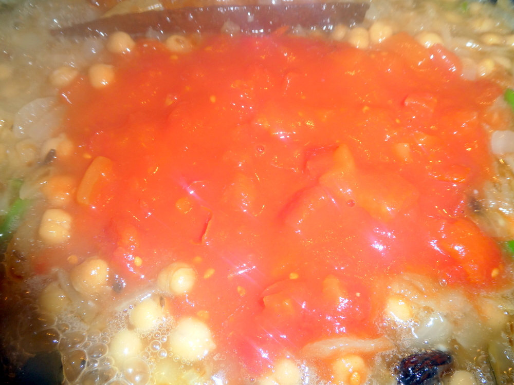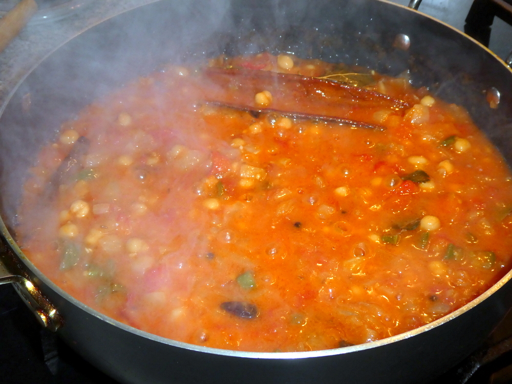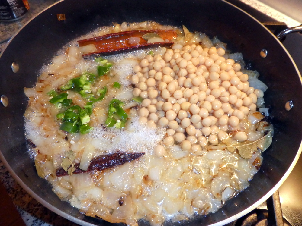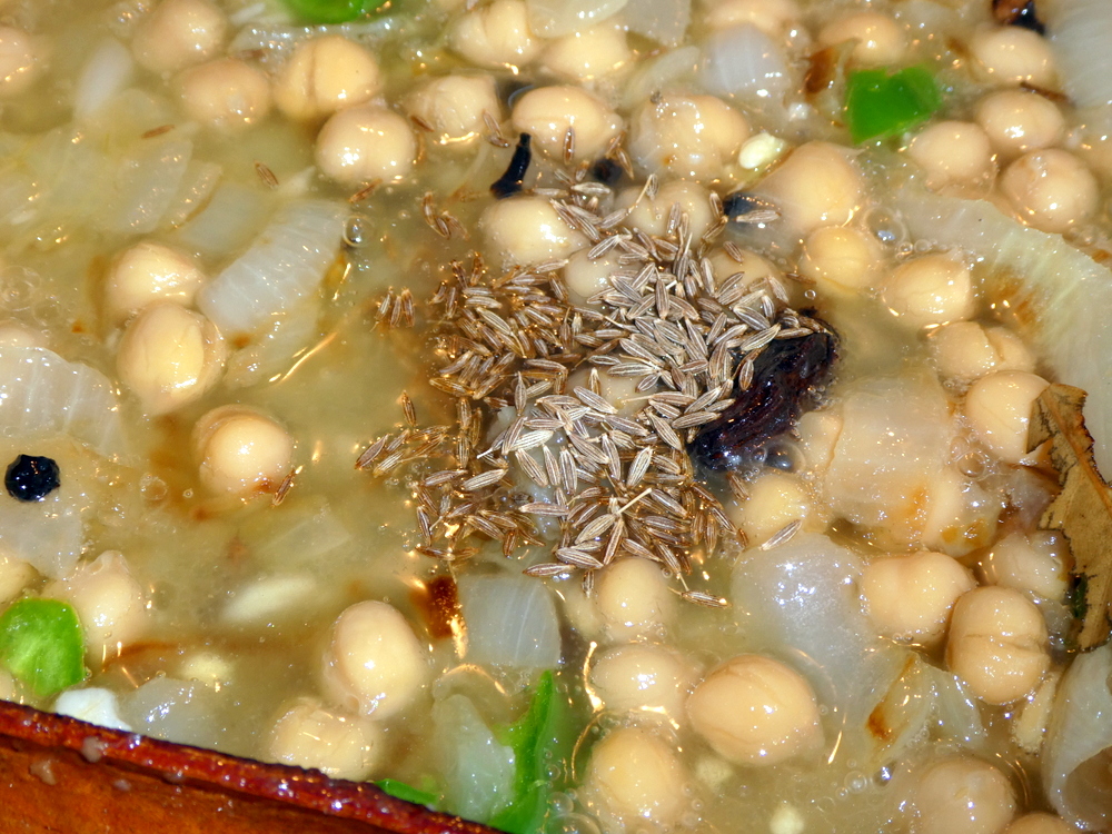 5) Add the chickpeas and the sliced green chillies, cook for another five minutes then add the cumin seeds and the water and bring to the boil.
