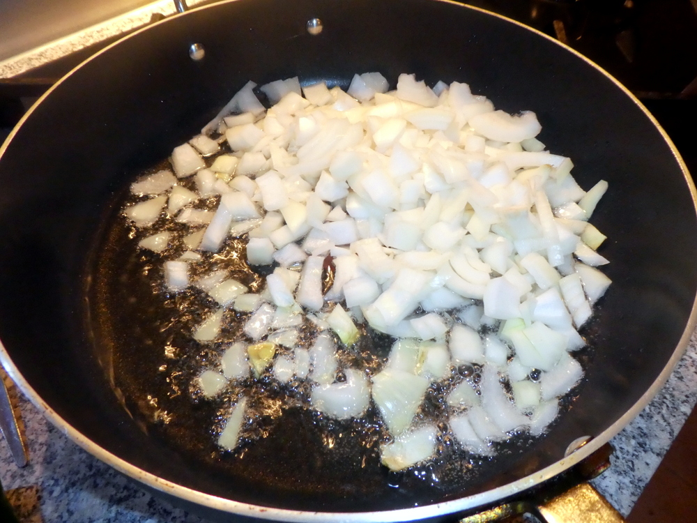 2) Heat the oil in a large pot, finely chop the onions and add.