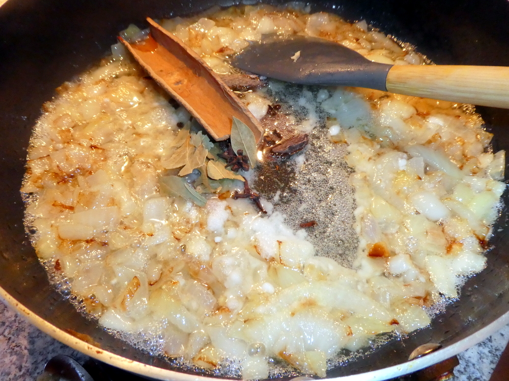 3) Fry the onions until they turn brown, then add the garlic, ginger, salt, cardamom, cinnamon, black peppercorns, cloves, bay leaves and tomatoes.