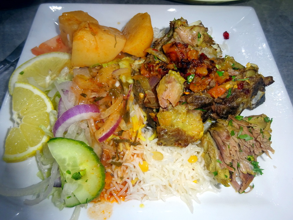One hates when the Mains arrive too soon, there was a suitable wait. The place was full except on my immediate right where a table for a large group was being set up. The Waitress came over to say our Mains would arrive in a few minutes. In the earliest days at Akbar’s they would quote a precise number, very silly. By the time the would-be Chef who brings the Mains arrived, we were ready. As always, he was happy to pose. It actually took three people to bring the entire order, a Waiter asked me to verify that everything had been delivered. All was well.
