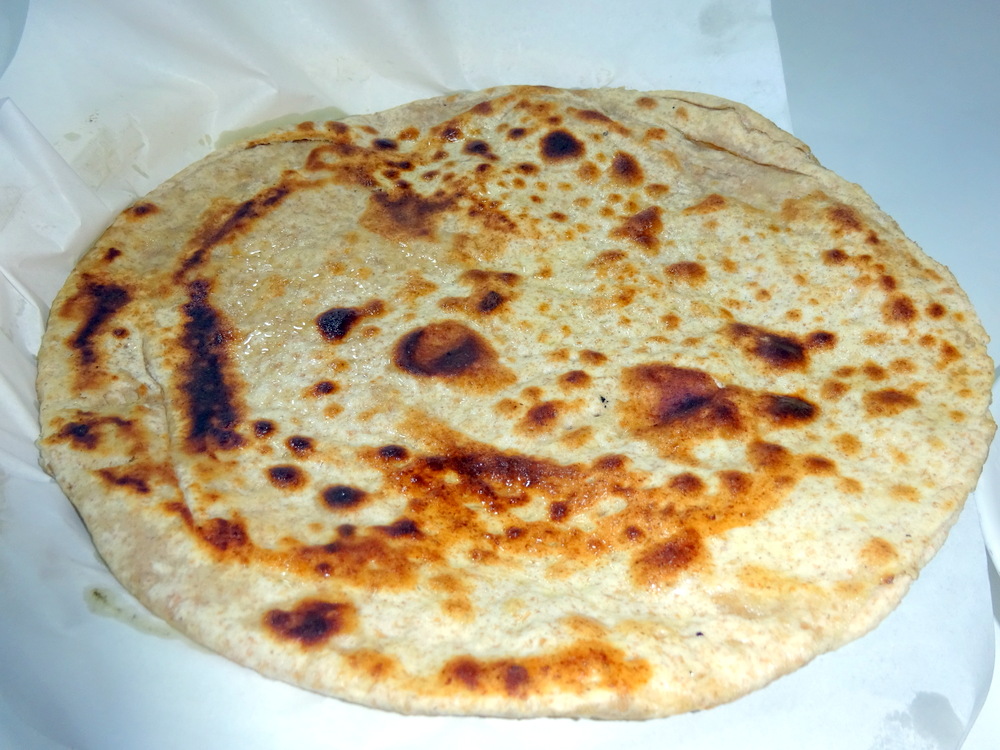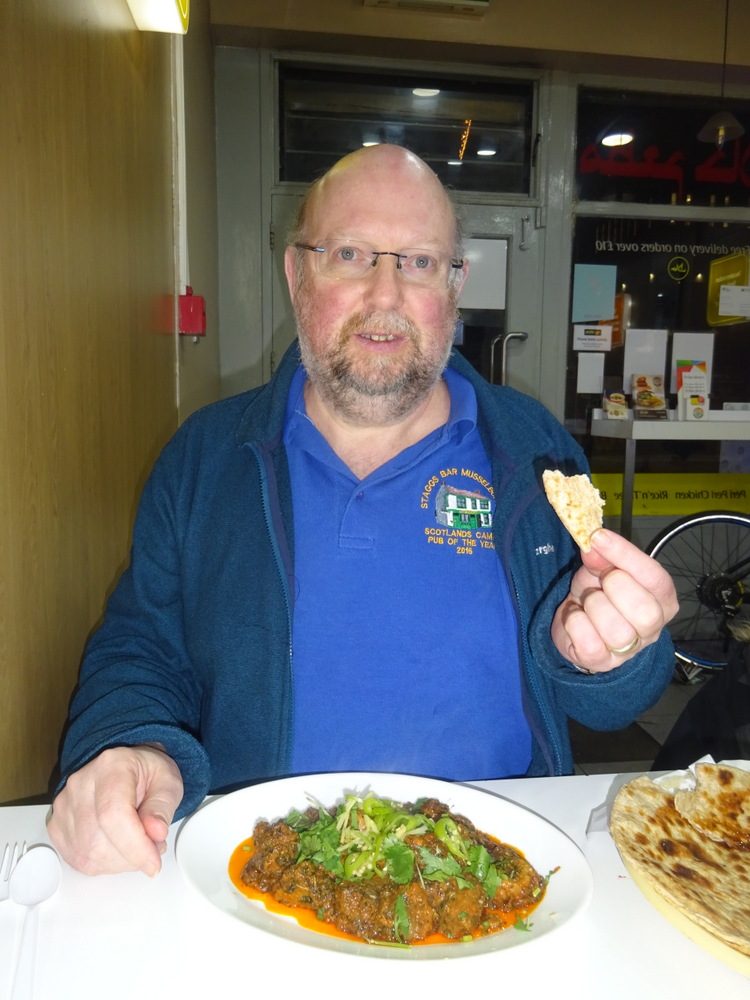 The Paratha was up to the expected standard – Large, Layered, Flaky and – Whole! I would eat more than half, Peter took his promised piece. The Chapattis were for Marg and Rory, they probably had Naan also. Ours didn’t fall off, it wasn’t finished but we did it – Justice!