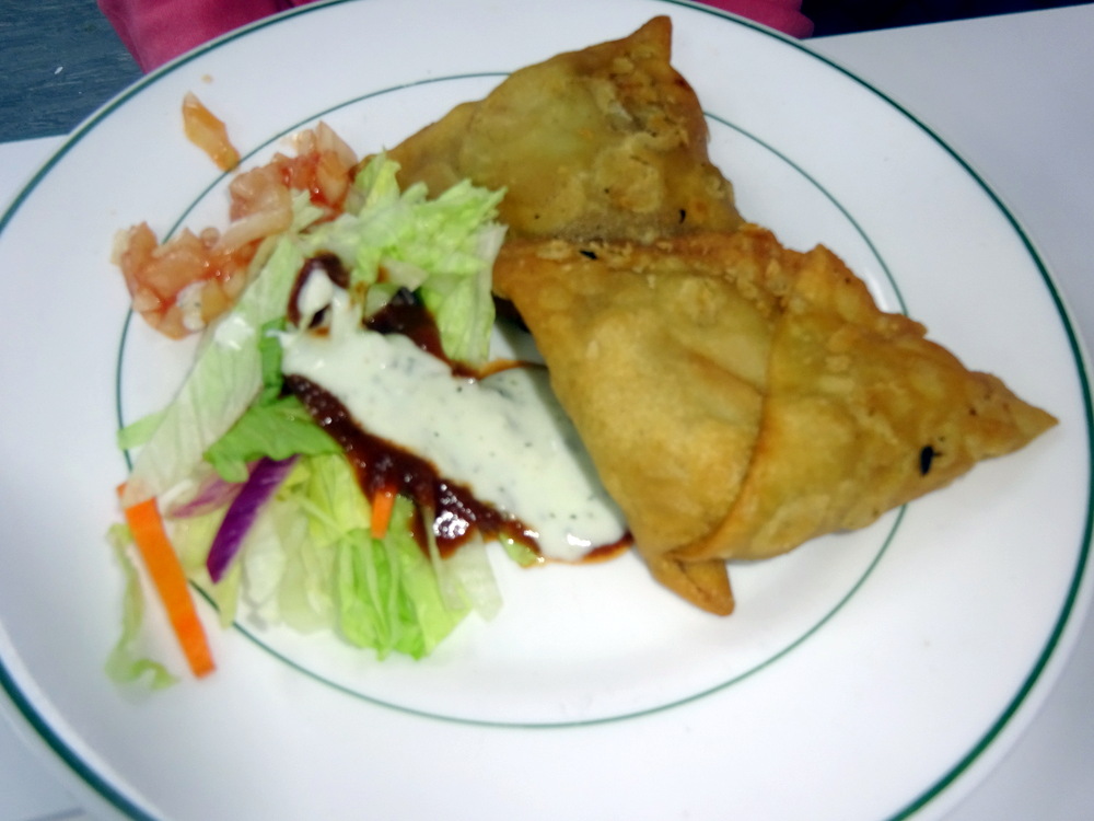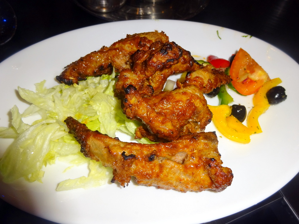 Hector was on a roll, the Onions had continued cooking on the platter, a fine break between the Samosa and the flat piece of something or other which had us both puzzled. Aubergine, no it was Meaty. What is Flat, Spicy, very Tasty and Meaty? Donner! It had to be, quite a a surprise this was, and it worked. The Chicken Drumstick in spicy breadcrumbs was a bit of a let down thereafter. That left the remaining piece of Chicken which was way better than that which had preceded it. Lose the Drumstick, add a Lamb Chop?
