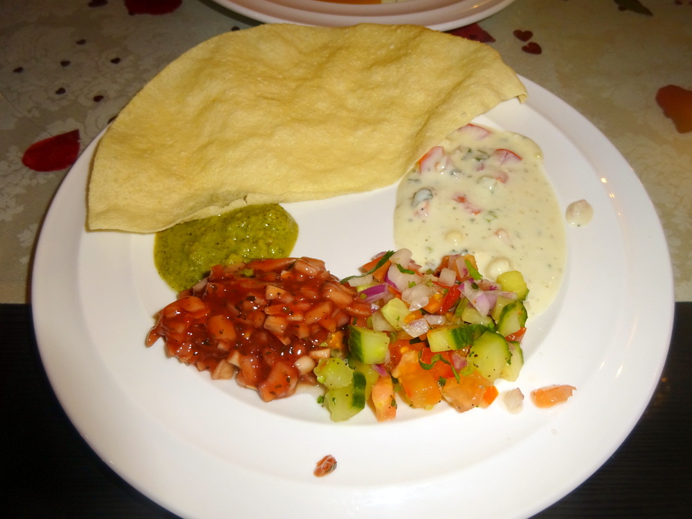 Whilst we waited for the official Starters, we were invited to help ourselves to Poppadoms etc. from the Buffet. The Tomato and Cucumber Salad took us back a few nights to our Carnoustie Curry. There was just enough time to polish off this plateful when Hector’s first indulgence of the evening was presented.