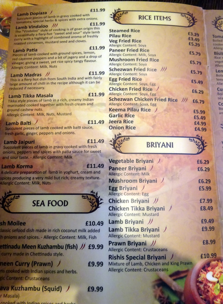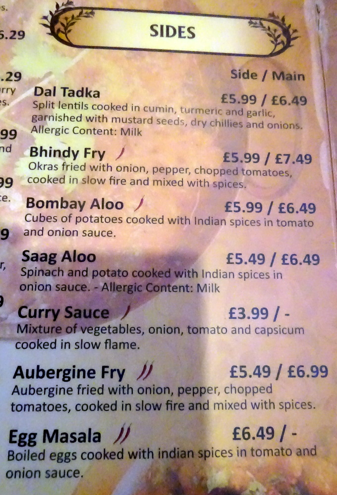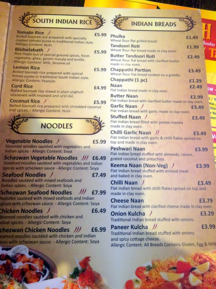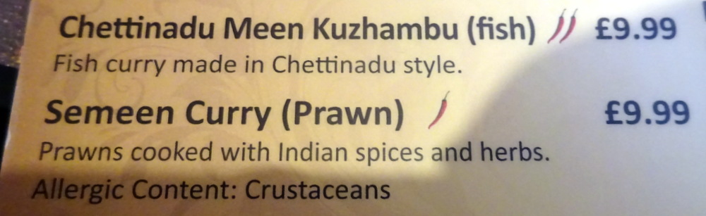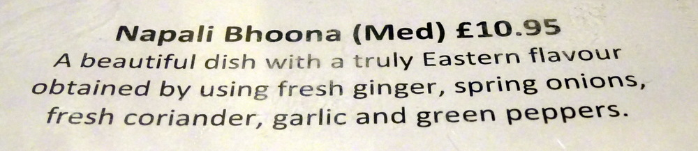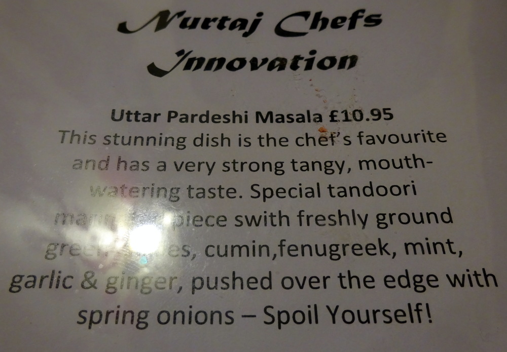 This had the makings of a very good Curry. The lamb was soft, and the spice level excellent which built during the meal. The disappointment was the Masala which lacked something. I consulted my Curry correspondent with whom I agree regarding the Seasoning which could have made a good-ish Curry even better.
