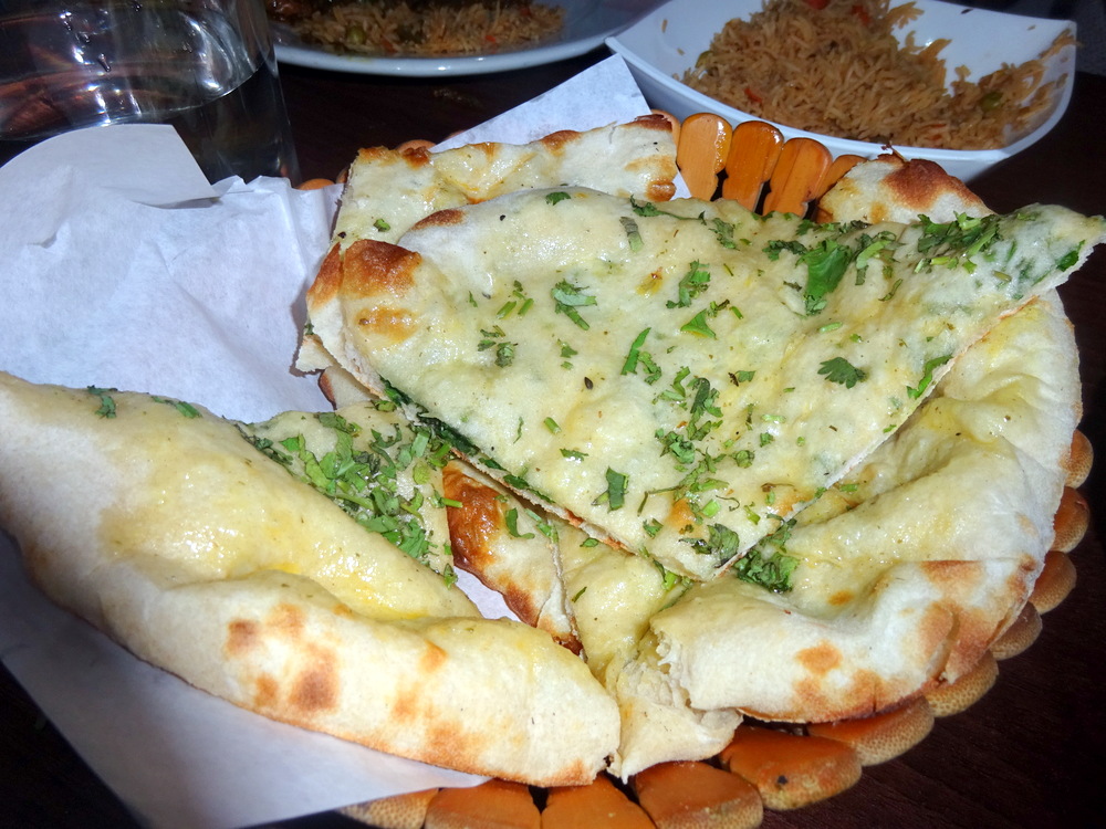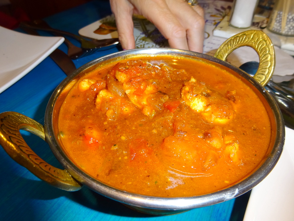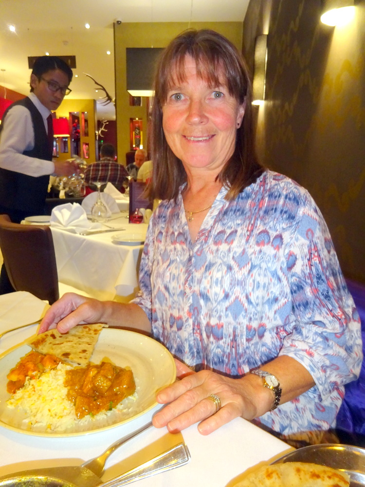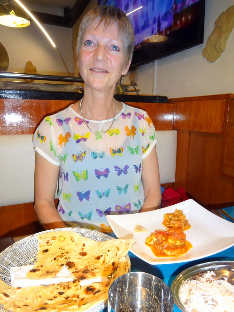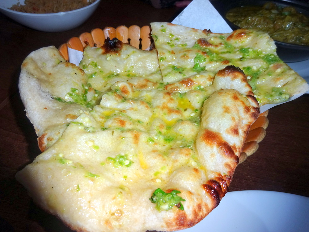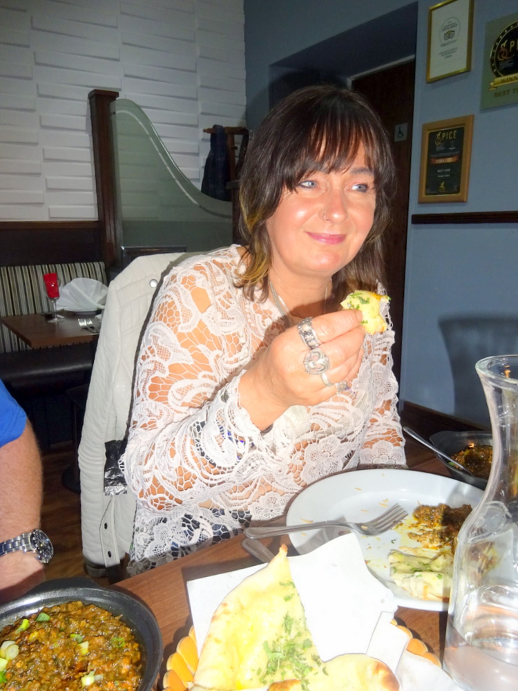 Chilli and Coriander – was the proclamation for the Naan placed before me. This one was wet and shiny, Garlic. I had specifically asked for no Garlic. There was an offer to change it, but that would have held up the meal. Stick with what we have. Tracy was keen to try mine. It was then we realised that the – Dry – Naan may have been the Chilli and Coriander Naan. I saw no Chillies. Confused? We all were. We swopped Naans, no more Garlic for Hector. Yay!