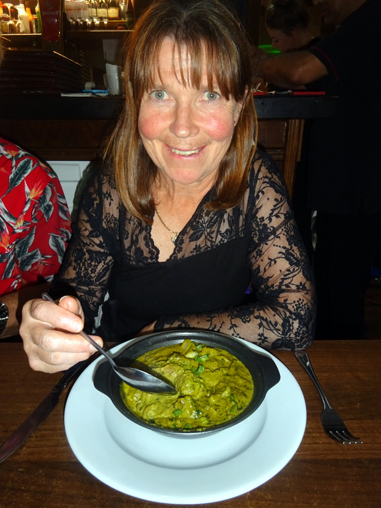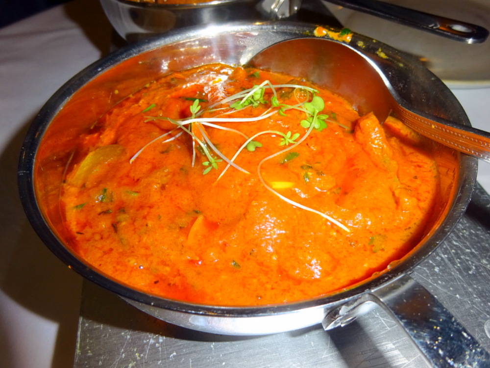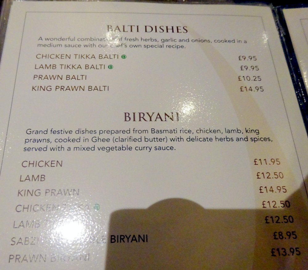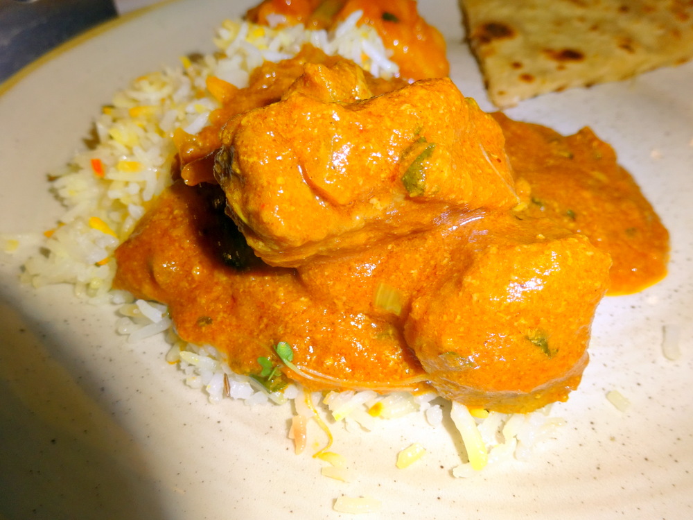 On asking for the Hurry Curry Lamb, Rocky suggested Marg try the Maliadar Sagg (£11.95) instead. Did I hear – Creamy? That was enough to swing it. Marg was offered on-the-bone or Boneless. She chose – Boneless – then explained to – The Company – that although she knows on-the-bone has much more Flavour, she does not like having to pick up the Meat to eat it (properly).