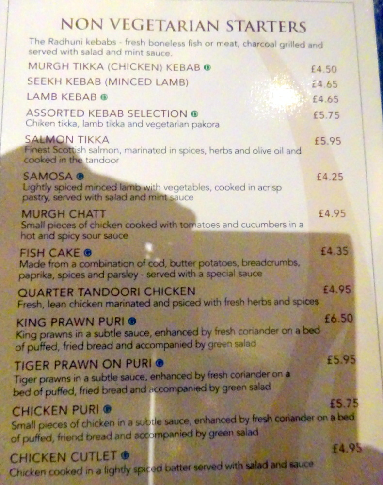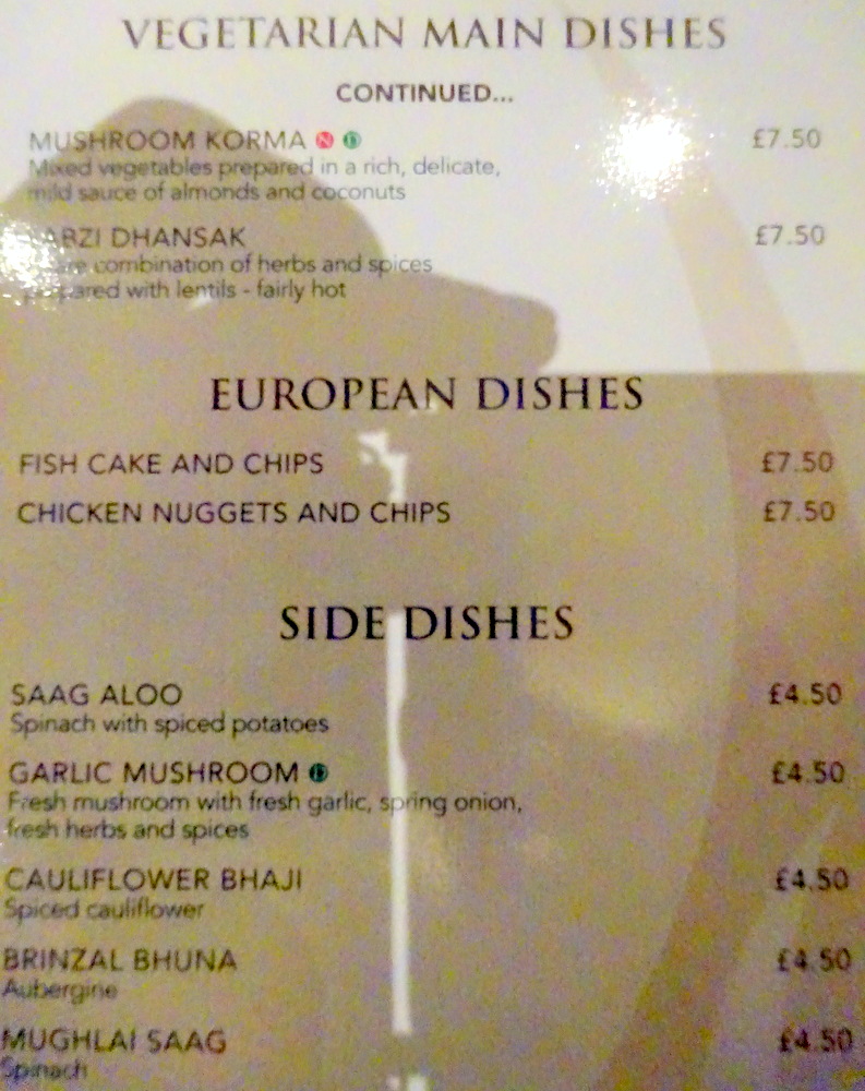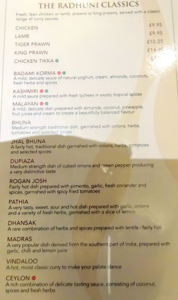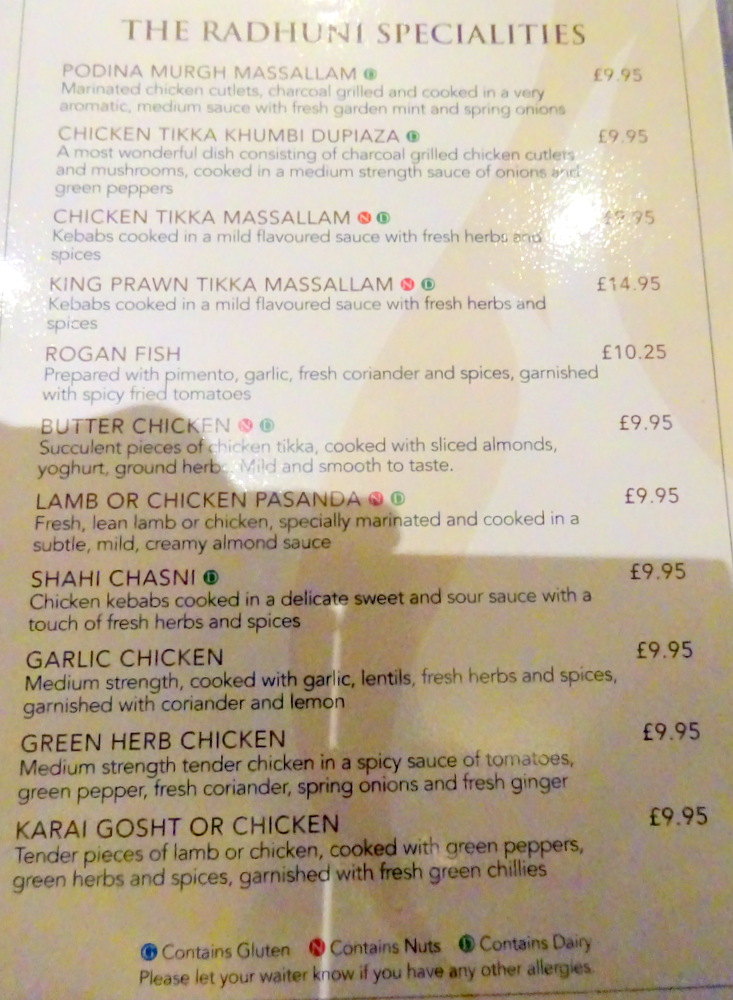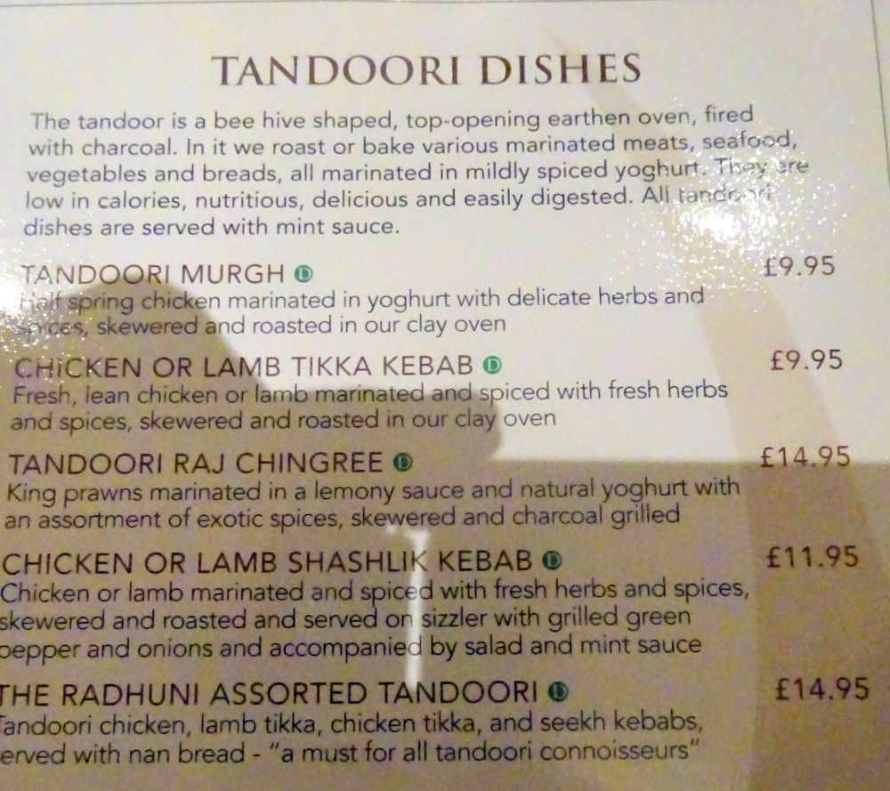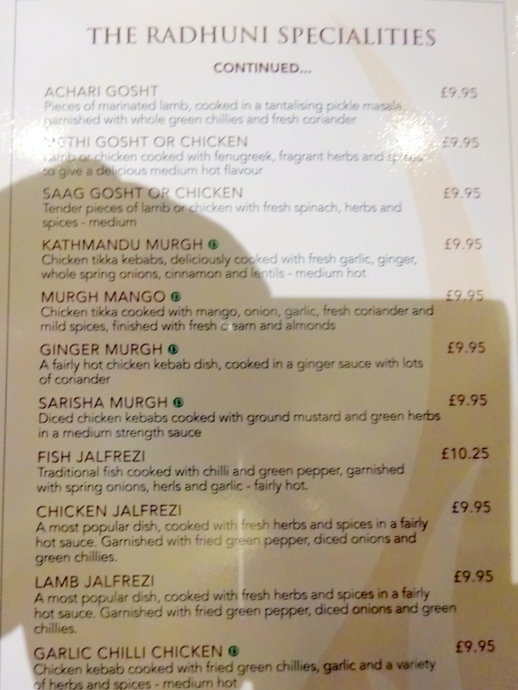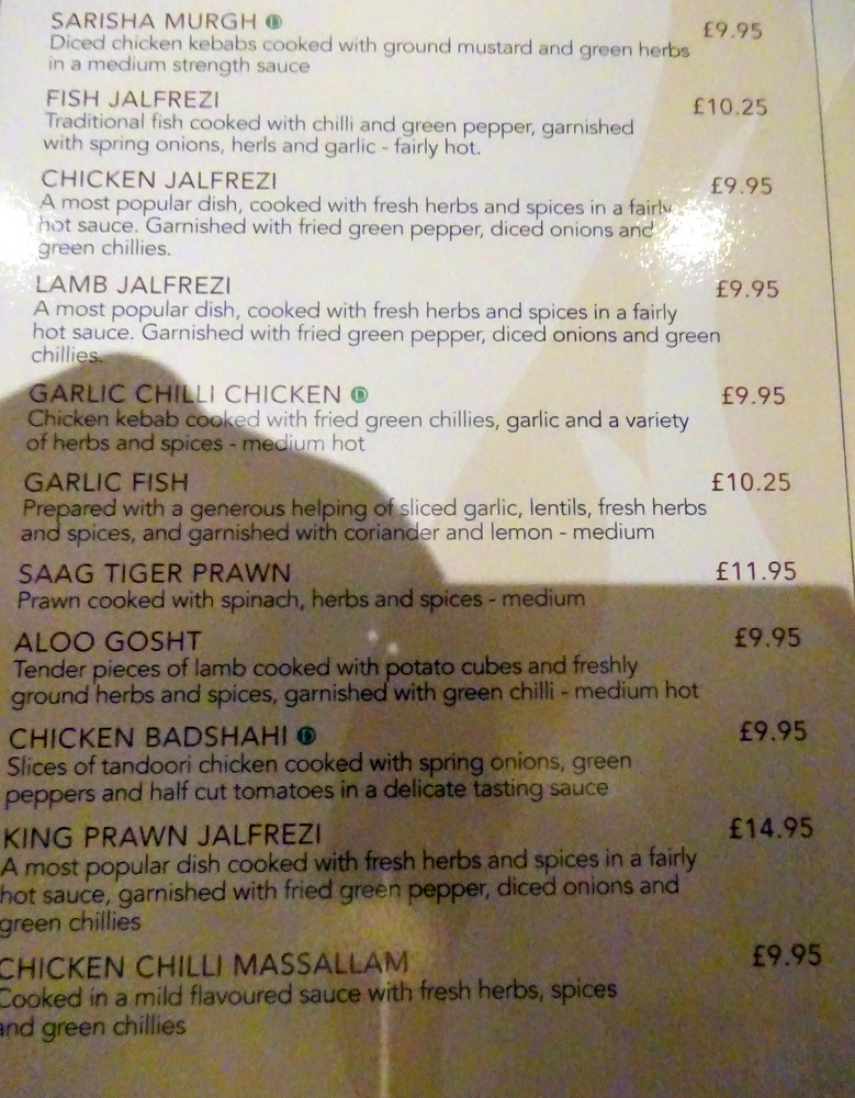 Tracy enquired about the availability of Chicken Tikka Methi (£11.95), not on the Board or the Menu. Success, flexibility, is this not how it should be? Marg liked the description of the Hurry Curry Lamb (£9.50) in which – fresh green vegetables, herbs and spices – would feature.