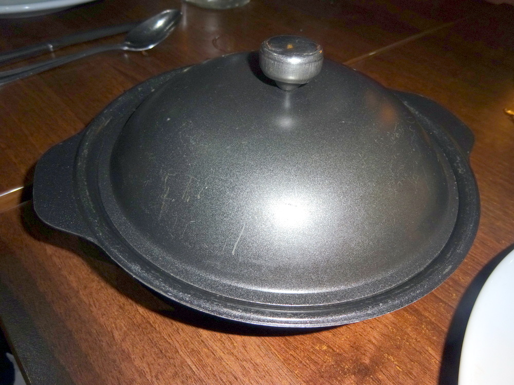 At 21.13, four very hot plates were brought to the table. A different chap wheeled the array of food to the table. Lids on the Mains momentarily concealed the contents, no peeking.