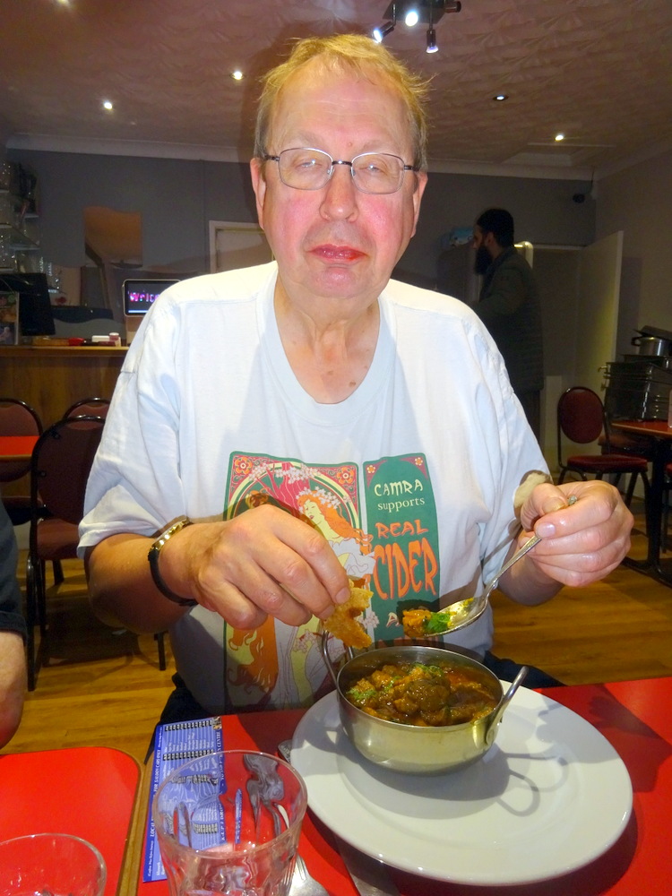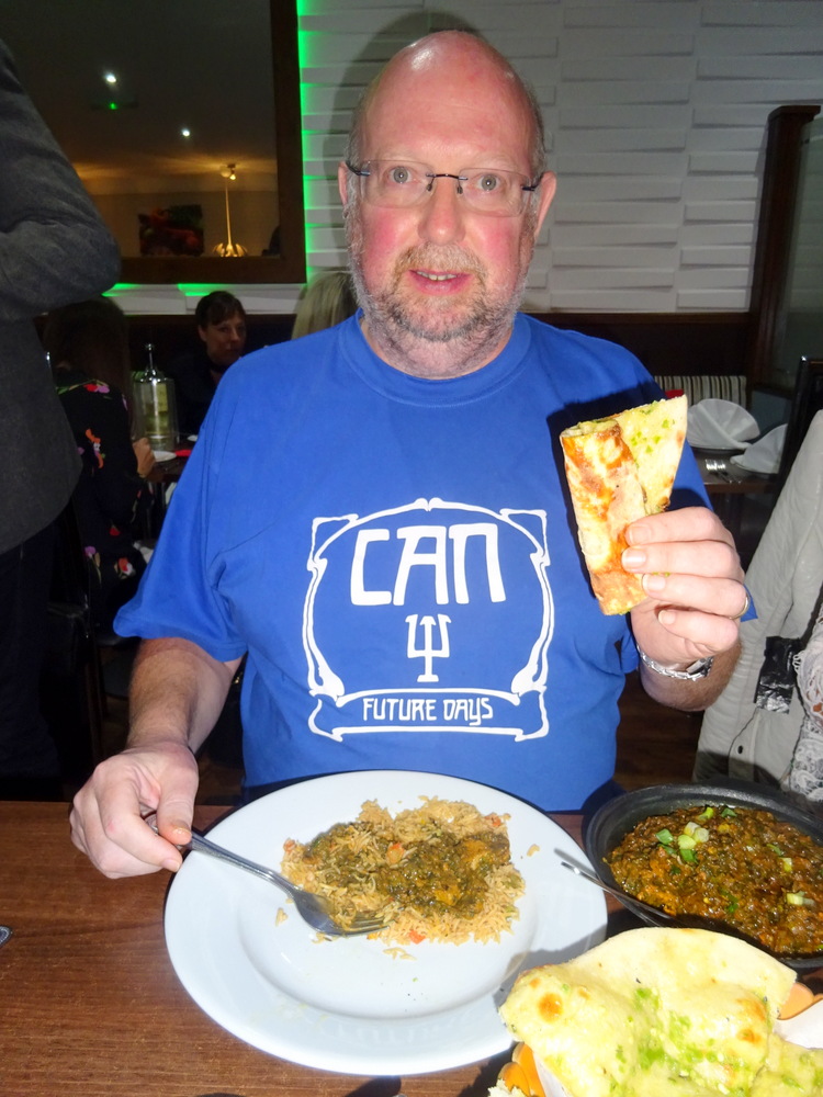 Alan evidently thought one Rice was enough and so I asked for a Chilli and Coriander Naan (£3.50) to which Tracy added a Garlic and Coriander Naan (£3.50). Marg would have her customary Chapatti (£0.90). Somehow I noted three being ordered. My introduction of a Naan may have changed Alan and Tracy’s plans.
