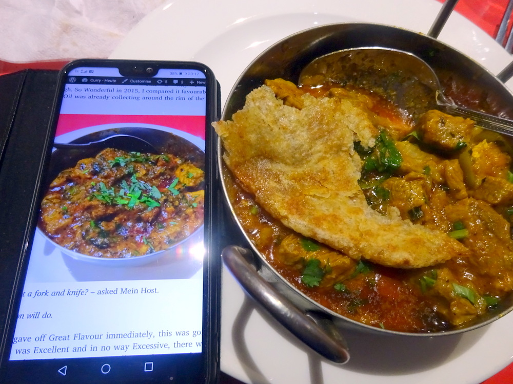 Rocky came back for a quiet word, he wanted to verify my Naan – Chilli and Coriander. My turn to explain to those assembled that I presently find that Garlic tends to dominate when pasted all over a Naan, interfering with the actual taste of the Curry.
