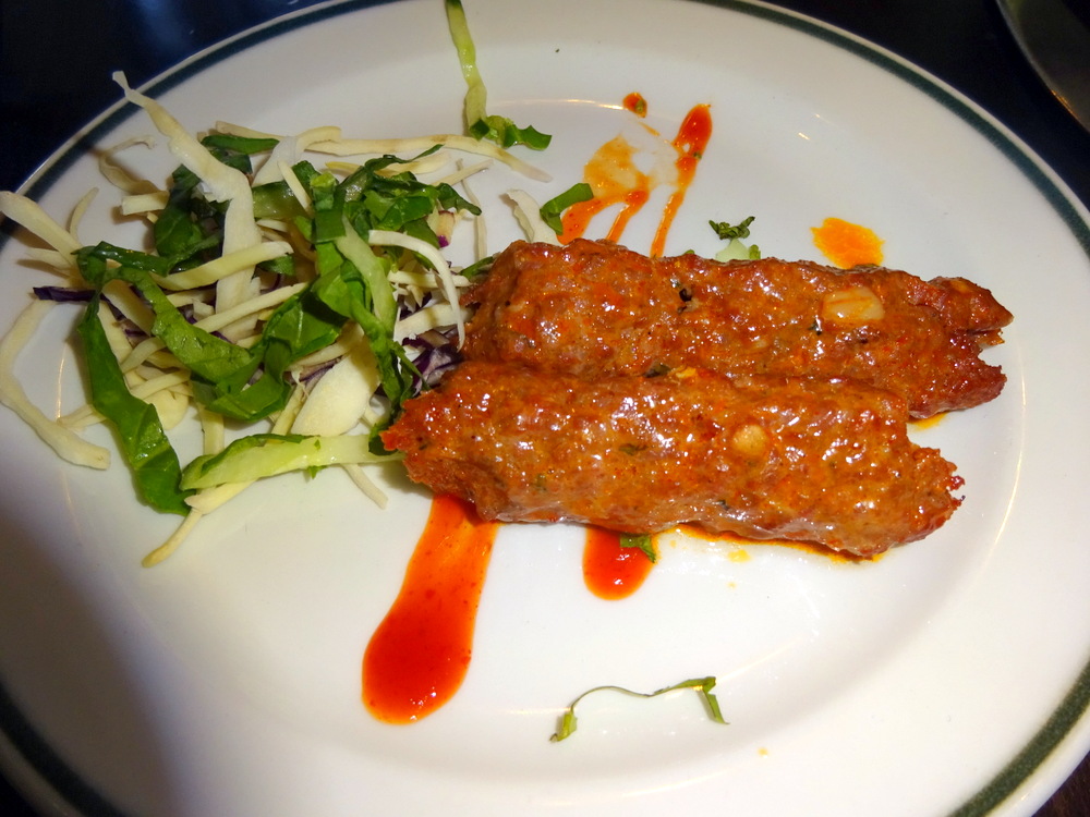 Within seconds a table for four was assembled adjacent to the Bar. This was like something from a Hollywood movie. As soon as we were seated, Alan drew the attention of the Drinks Waitress, he was keen to get the Lamb Chops ordered (£6.50). As a regular here, he knows how long they can take when Annaya’s is this busy. Three portions, three Chops in each, Hector would lose out, Marg would pilfer one. What is this with sharing?