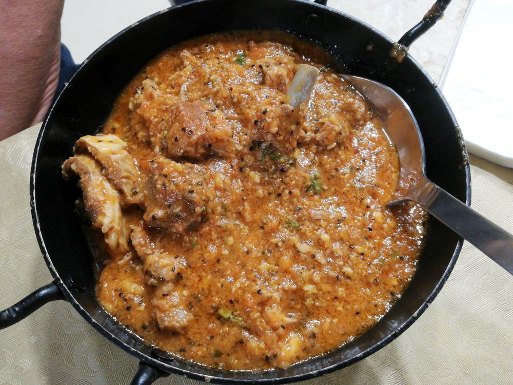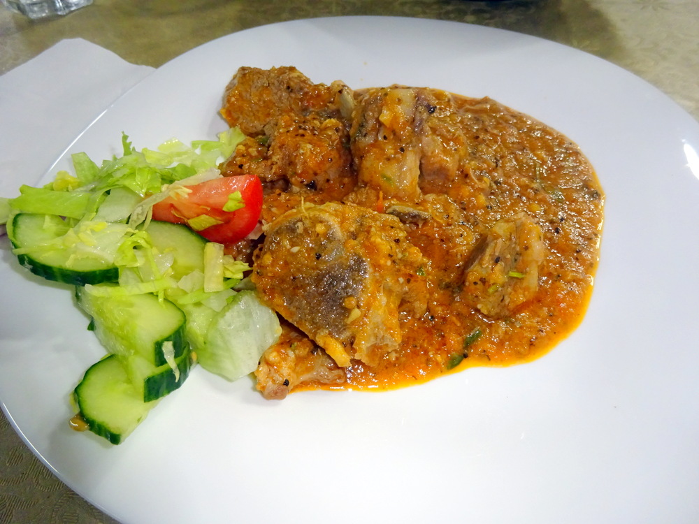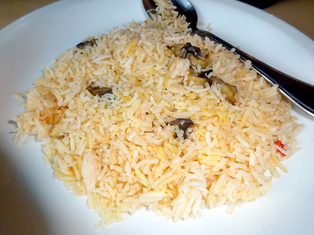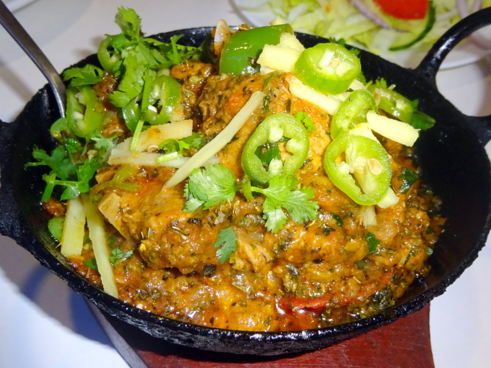 A feast on a platter, the appearance suggested somewhere between Karahi and Stir Fry. The description said it would be – Dry – there was exactly the ratio of Meat to Masala I seek. Thankfully this Curry was not simply Meat and Masala, strips of Onion, chopped Green Chillies and possibly Syboes too were in the melange. The Lamb was well into double figures and very Tender. The Spice was Moderate, not challenging, it could have done with more. The Seasoning came through and so the complexity of Flavours began to reveal themselves. By the third visit to this Dopiaza variant, I was getting Cinnamon and Cloves. Thereafter was the cognisance that this was indeed a new taste experience, Earthy, slightly Bitter, something unique. It lacked the – Wow! – factor, more Spice may have added an edge. Medium with a Kick?