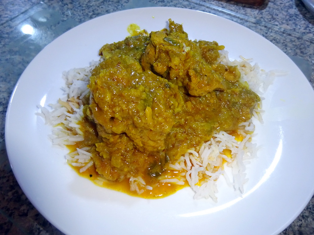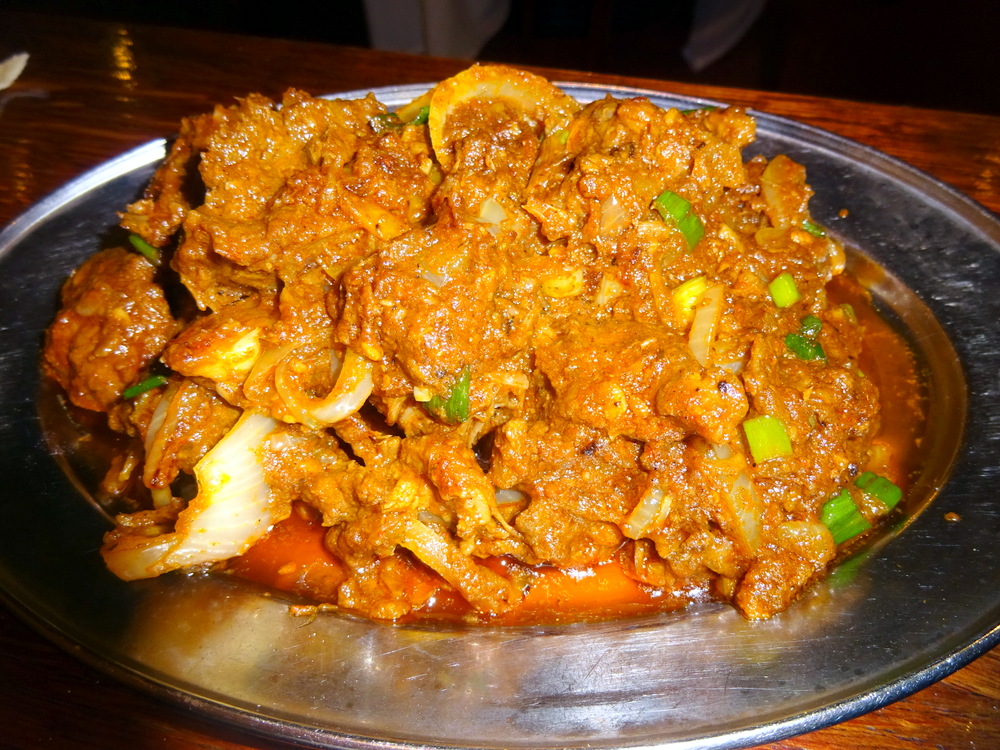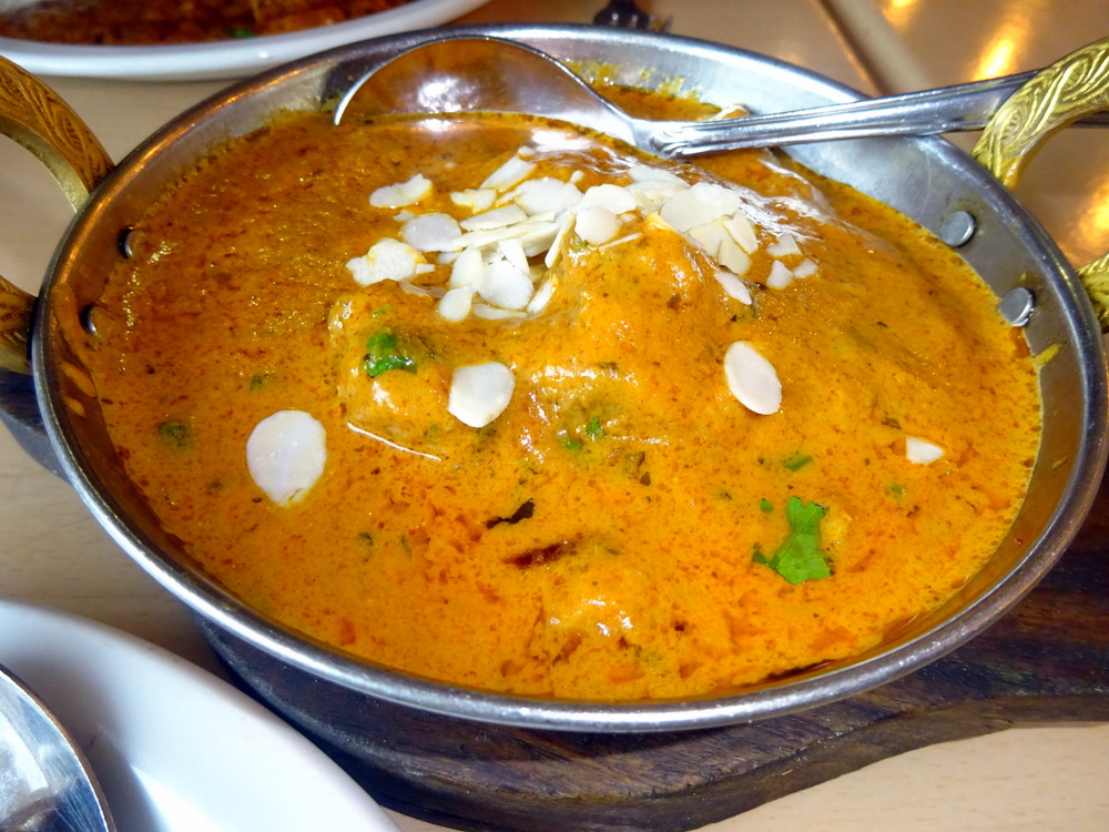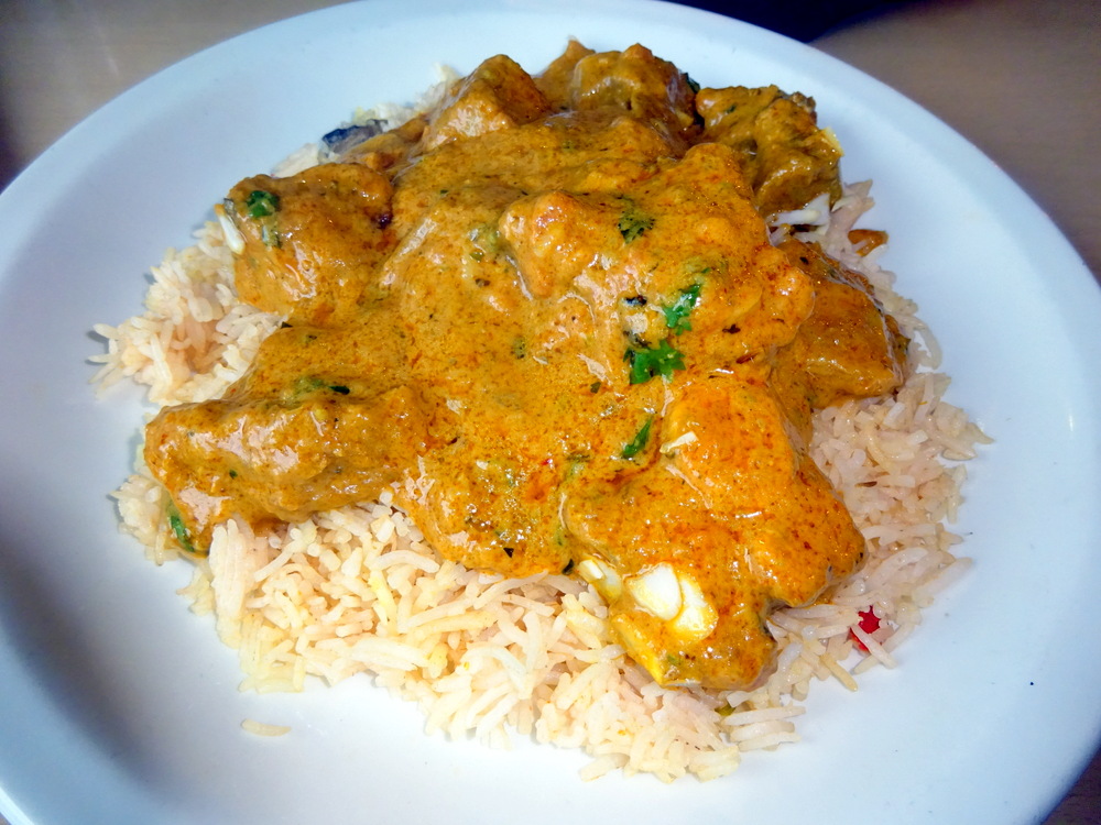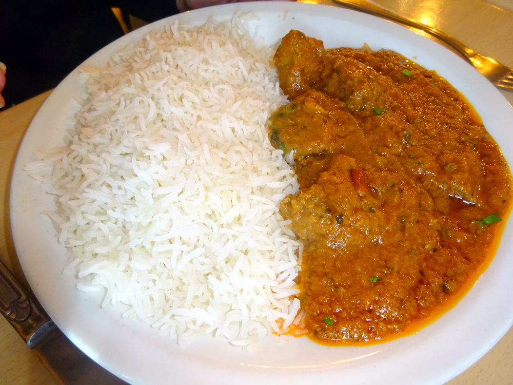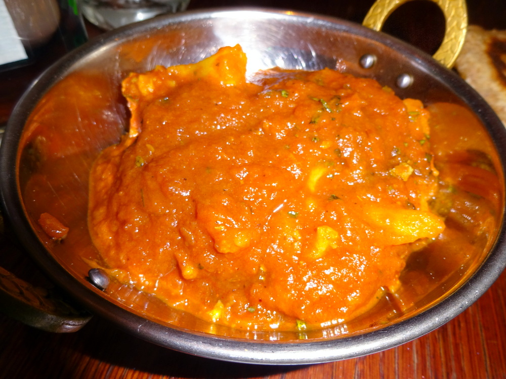 I ate half of the Poppadom so as not to spoil the appetite, the Spiced Onions impressed. The sauce was pale, the horrible Red Food Dye not employed here.