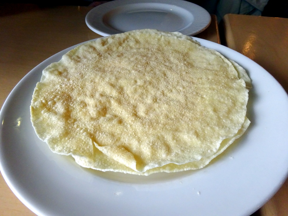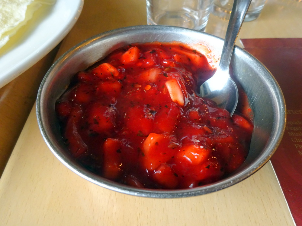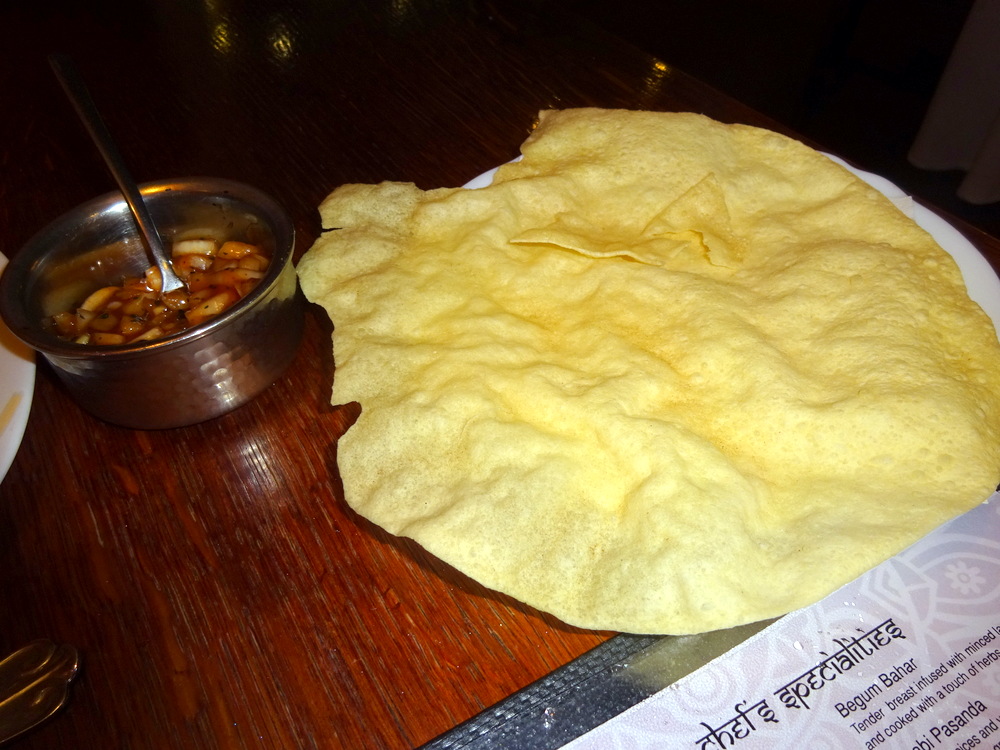 I prepared for the wait and given that my locus was in full sight of all those who were dining in the front room, three couples (plus the wean), I could not photograph my surroundings. I had previously restrained myself and had not taken photos of the Menu. The camera had to make an appearance when a Complimentary Poppadom and Spiced Onions were presented by the Waitress who had brought my Sparkling Water.