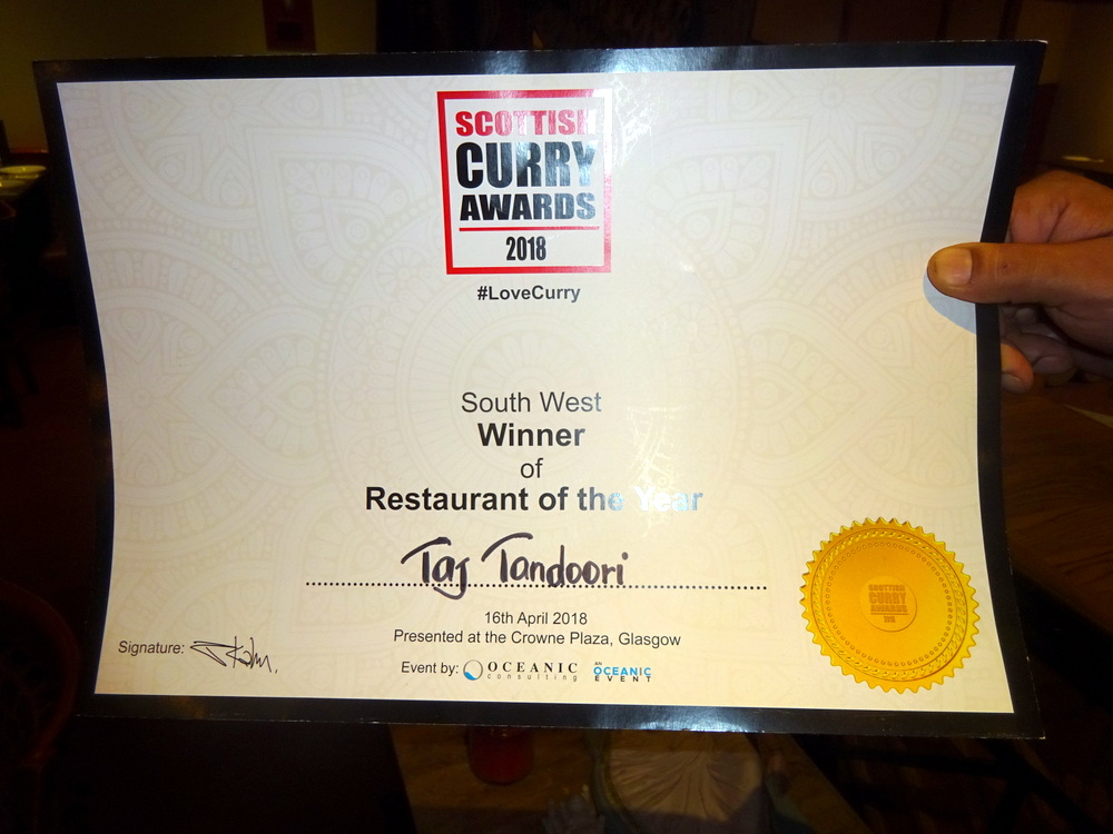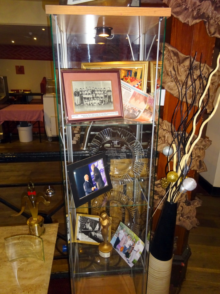 Taj Tandoori has won many Awards, there was a display cabinet, who wins awards? In this year’s Scottish Curry Awards they won – Best in South West Scotland, and in the voter’s choice – Chef of The Year. I recognised the glass plaques, none of which sit in Hector’s House. (Finalist for – Curry Lover of The Year – four times.)