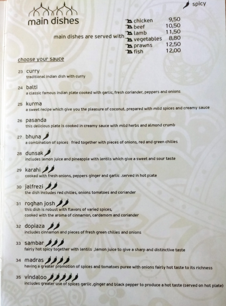 The five Dishes that might be worthy of a Hector were listed together. I had to ask the difference between Fish Curry (€8.00) and Fish Madras (€8.30). The explanation was not convincing. It was time to play my joker – I showed the photos of Capsicum on – The Curry-Heute Campaign – page. I was told that both of the Fish Dishes had Capsicum.