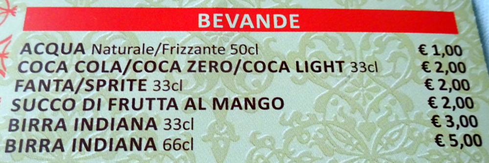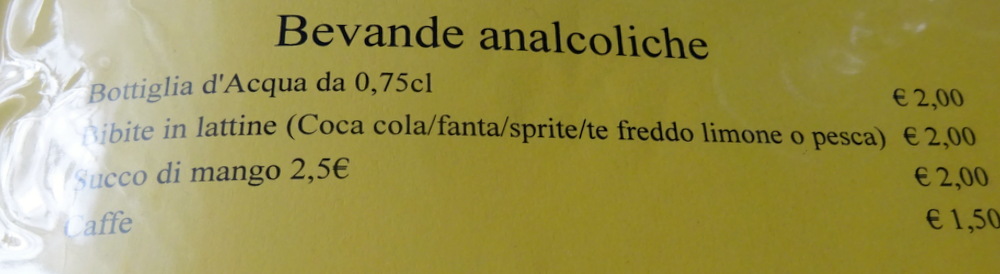 The Menu has 250ml Bottles of Acqua Frizzante at €1.50. We secured a 750ml Bottle at a price to be determined later.