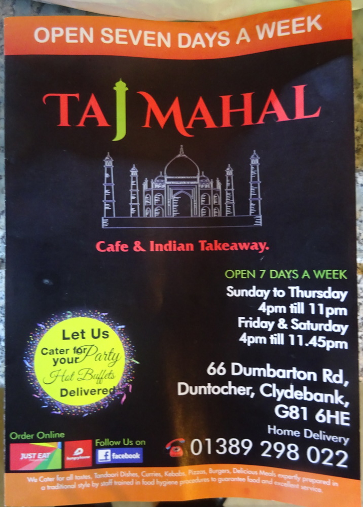 Taj Mahal (66 Dumbarton Rd., Duntocher, Clydebank G81 6HE), a Cafe and Indian Takeaway, so says the blurb on their Takeaway Menu. A Cafe? Hector had a mental image of a Curry Cafe with prepared Dishes on display. Allegedly open early morning serving a British Breakfast, at least some sit-in facility was anticipated.
