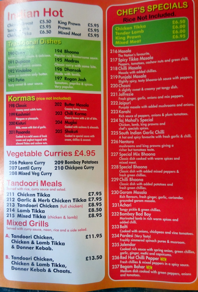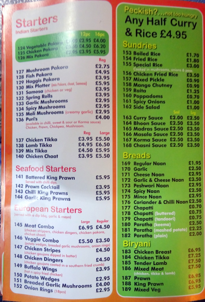 I waded through the Menu, Pizza, Kebabs, Burgers, then finally two pages devoted to Indian Cuisine. I liked the – Any Half Curry & Rice (£4.95) – and wonder how this works. Such is the size of a typical – Glasgow Takeaway – this could mean only having to order one Main Course if ordering for two.
