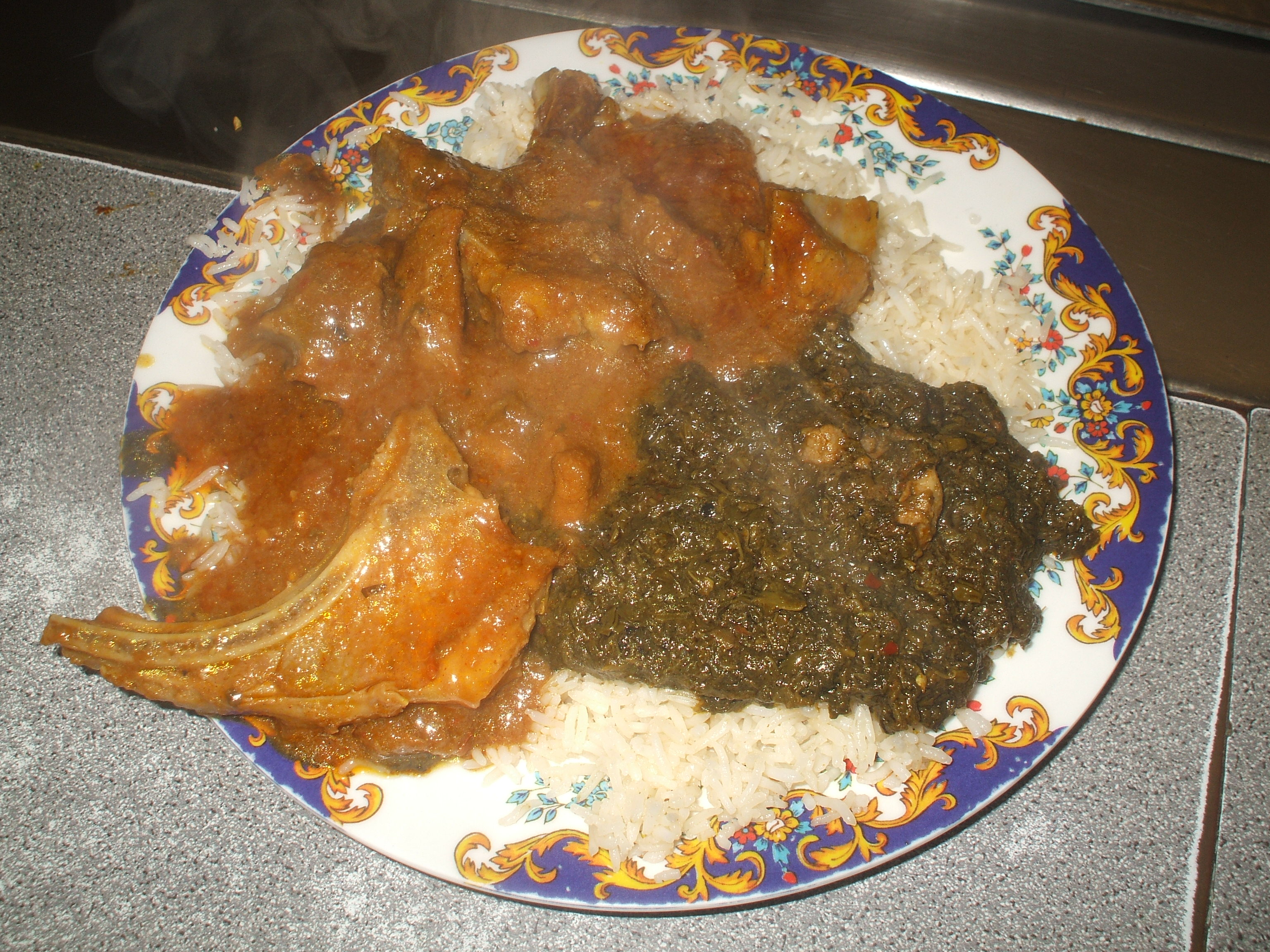 Three Curries with Rice – is how they advertise themselves, and for not very much money. All the Curry was on display, I acted the innocent and asked what they were. I had already selected my choices. The waiter/server/Chef stated that all were – mild – except for the one on the near left. This was Lamb on-the-bone. It looked very much like a Lamb Stew, it was. Whilst he was describing the Curry he filled a plate with Rice. Here we go. He heaped on a generous helping of the Lamb. Saag Gosht was at the diagonal to the Lamb Curry. On it went, I had to get him to put on even less. My reward for choosing only two Curries was another shovel full of the Lamb. I sat down, how on Earth am I going to eat all this. Had my strategy backfired? I paid, there was change from £5.