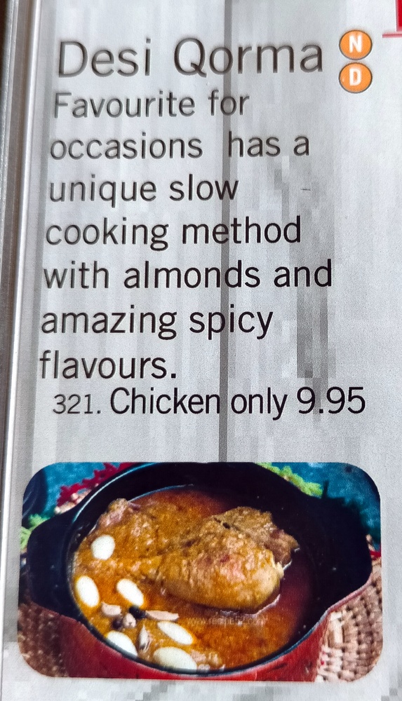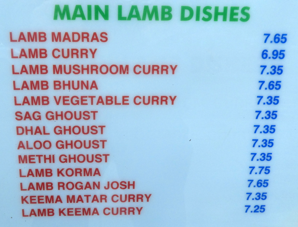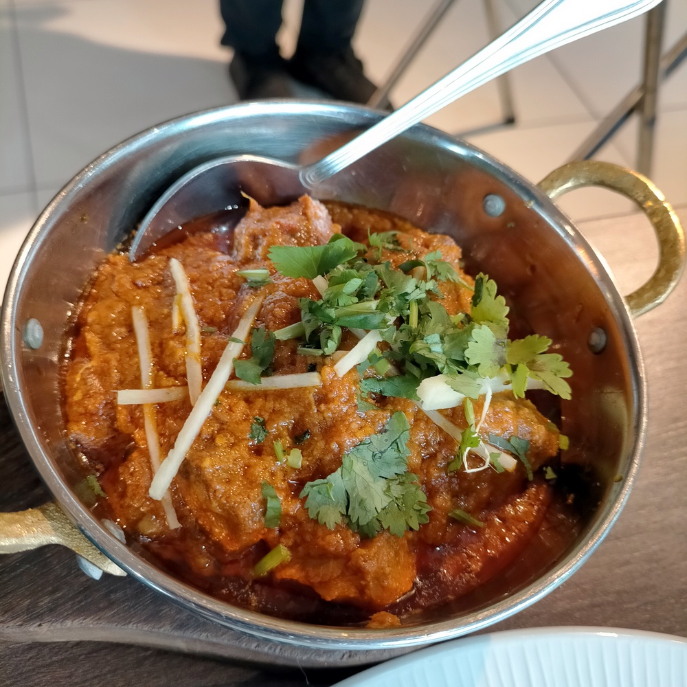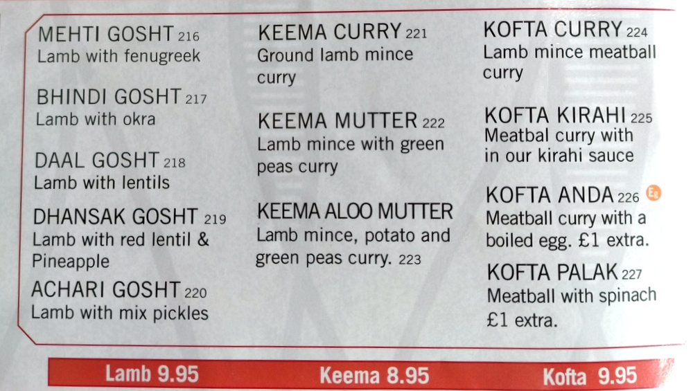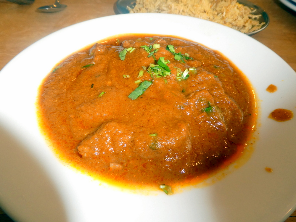 Today was Visit #4, as on Visit #3 I decided to try something different from the Menu. The description for the Lamb Rogan Josh (£7.75) was decidedly – old school. Where the – Creamy Variant – which now dominates menus in the Mainstream Curry Houses came from, nobody appears to know, I have asked my Curryspondents. The original – Tomato-rich – version became my staple Curry back in the days of the Akash (Helensburgh). This means I have eaten such a Curry many hundreds of times.