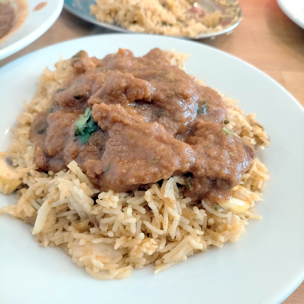 Now we know know what Kebab Mahal mean by – onion sauce – a Shorva. The slices of cooked Tomato were appreciably more than a Topping, there was masses of the stuff. I wondered if this was to the detriment of the Meat count, on decanting my fear was allayed. There was a mass of Meat below the Tomatoes, large pieces too, into double figures. With the very healthy portion of Mushroom Pilau, this was going to be quite a meal.