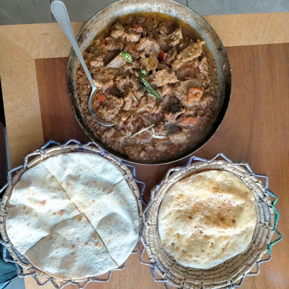 Marg has declared the Karahi as served at DumPukht to be her favourite, even though it comes with bones. The Lamb Lahori Karahi 1kg (£20.00) is the standard order. Previously, I believe Marg likes the Lamb Peshwari Karahi 1kg (£20.00) even more. Today we chose the latter with a Rogni Nan (£1.50) and a Roti (£1.00) as accompaniments.