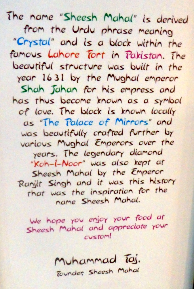 Howard and Tracey were first to arrive, they were introduced to Aqeel. All were assembled before 15.00. Two chaps came in as Aqeel was about to serve. I never established what they were ordering, it delayed our meal by some ten minutes. Dum Pukht was a one man show this afternoon.
