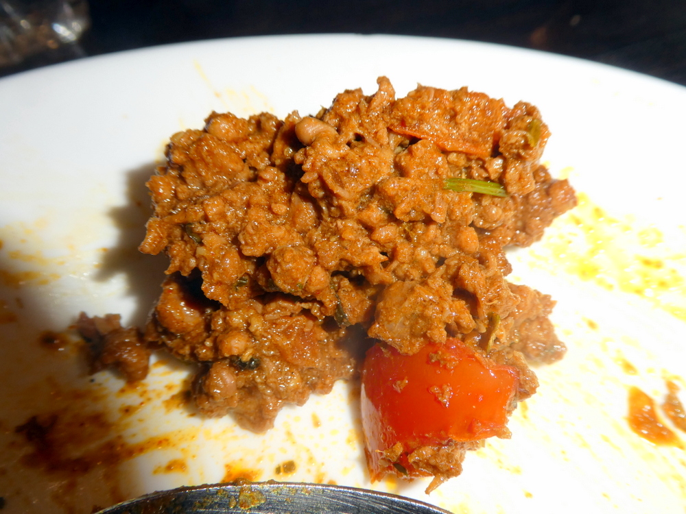 Thick strips of Ginger topped the wondrous sight. Bones stood out, I could only be sure that there was – enough – for everyone once first portions had been taken. I had managed to secure a Sucky Bone. The Masala was suitably Thick, shiny, the peripheral Oil was forming.