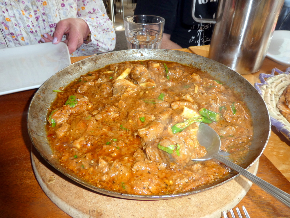 The first of the two flat karahi was placed on the far end of the table near John. Aqeel confirmed that this was one of two. The second was placed between Mags and Hector leaving Howard in no man’s land. Two kilos, I expected the ladies to eat less, John reckoned he could handle one kilo himself at a push. Drinks were offered, Sparkling Water is not available at Dum Pukht, a can or two went to the far end of the table.