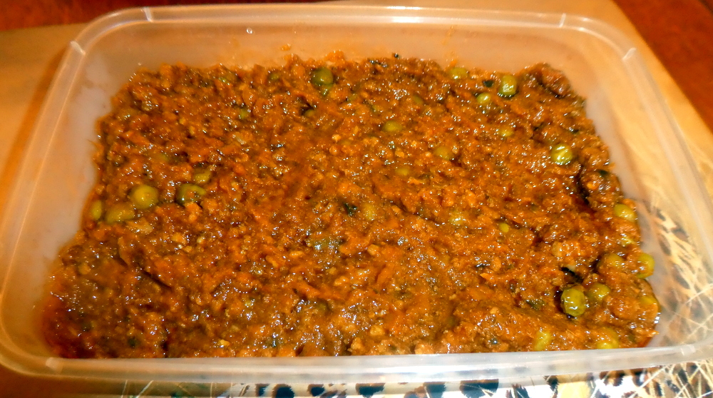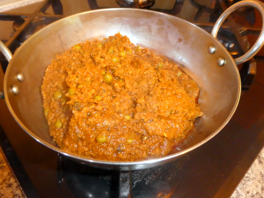 As Naveed listed the Dishes, I spotted a light coloured Keema. Marg had Mince & Tatties, her favourite, once again for dinner last night. She was not to be put off, Keema Mutter Aloo it would be. The Meat was Chicken Mince.