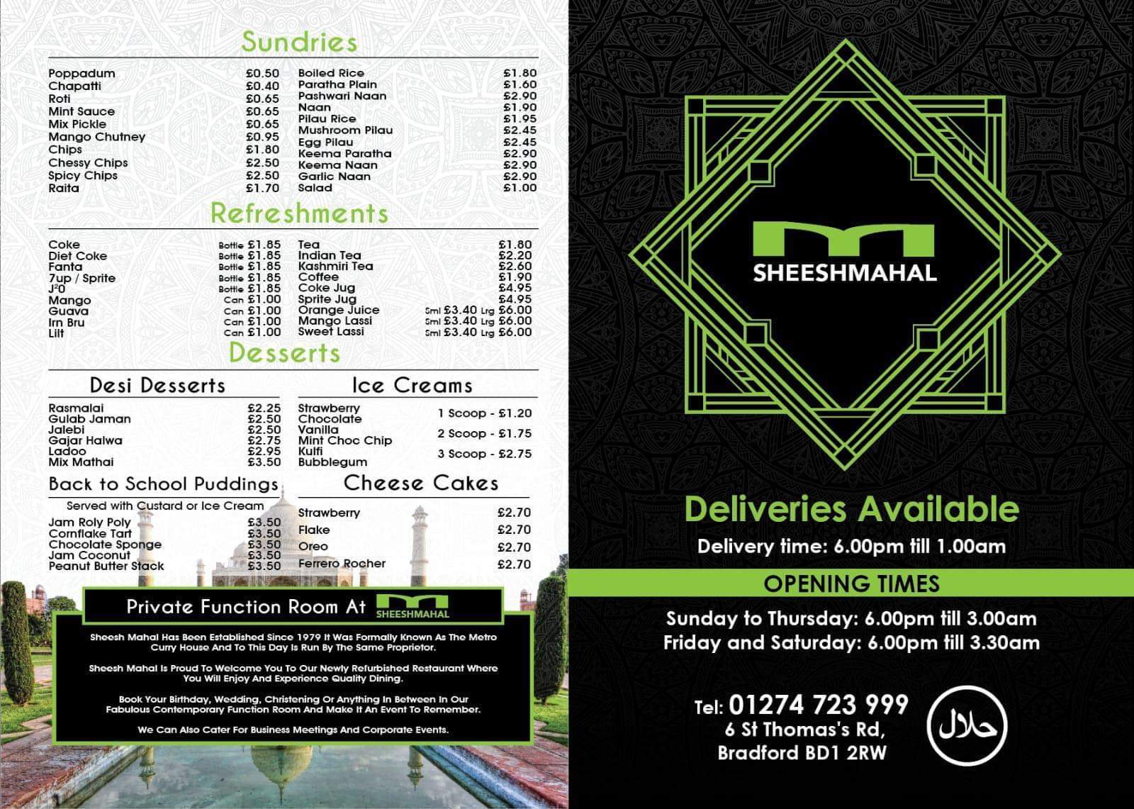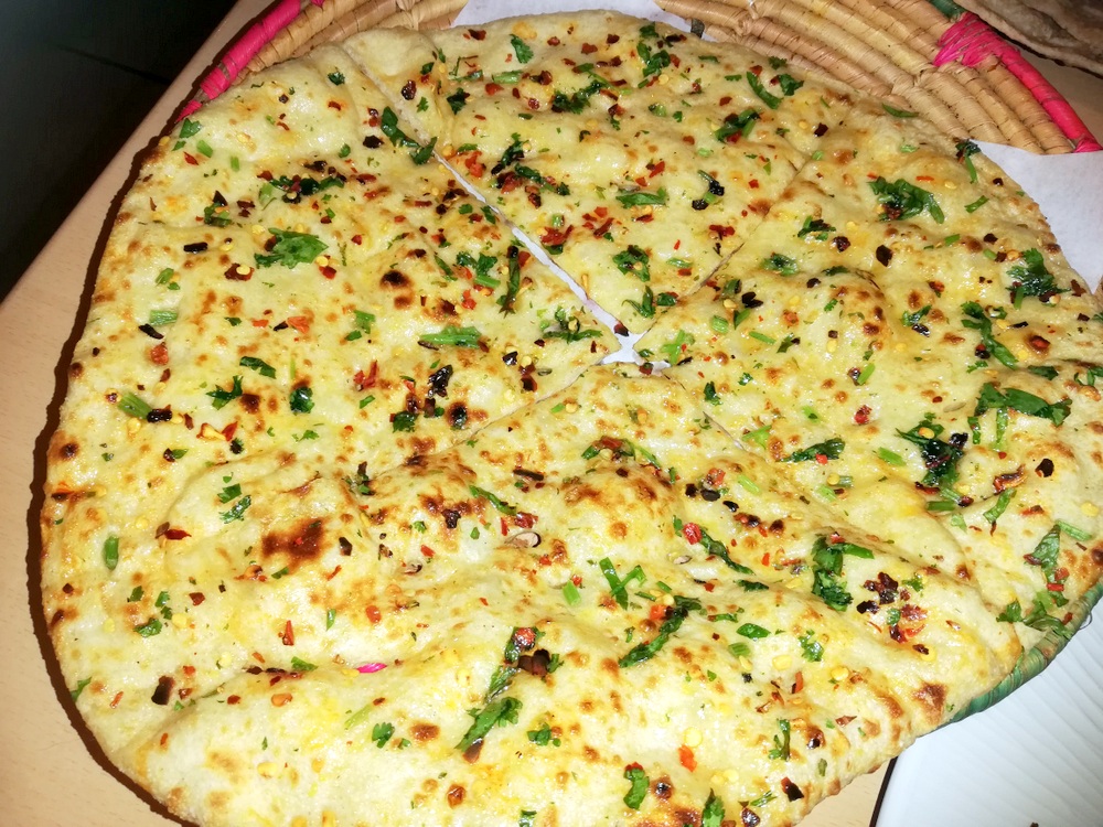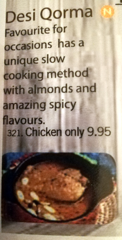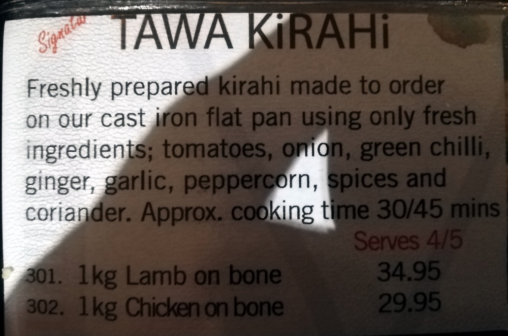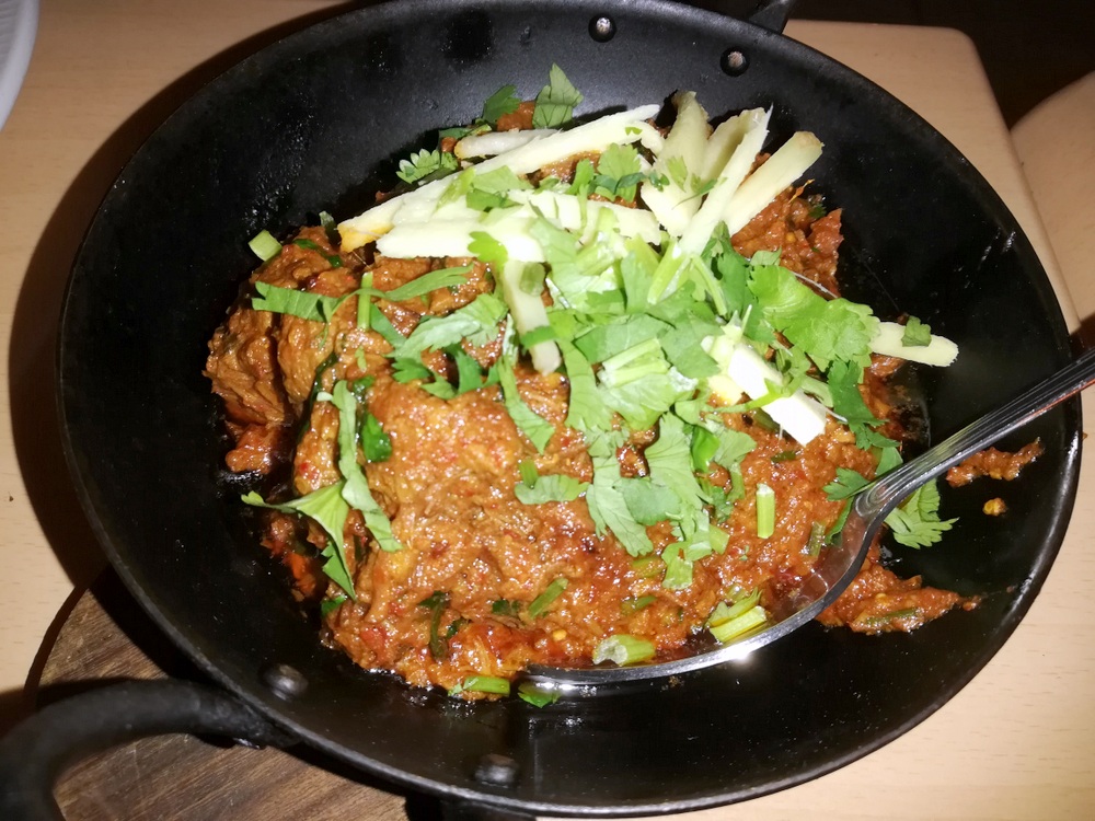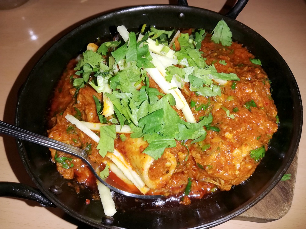 I texted Jazzy, Mein Host, yesterday to confirm the opening time for today and place the order: Karahi Gosht with Methi, twice. I did not ask for Lamb – on-the-bone – knowing Marg prefers standard, and I felt like something different. Today, on confirming my arrival time, I added two Chapattis (£0.75) and a Chilli & Coriander Naan (£2.50).