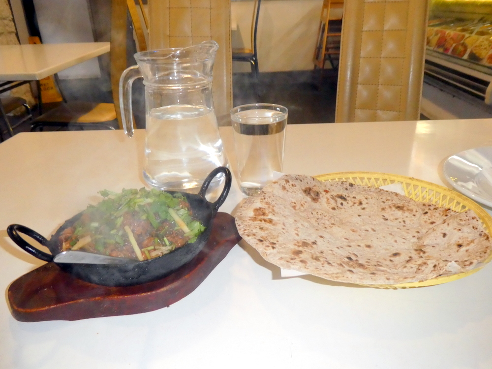 Having checked with Mein Host that the Cabrito (Lamb) Karahi (€8.50) was available, it was a matter of what to have with it. The customary Breads were all there and at sensible prices, Rice too. In a moment of perspiration, I haven’t mentioned yet that it was 21ºC today, in early February, Biryani de Vegetals (€6.60) caught the eye. In India, a Biryani always felt like the best accompaniment, especially when the prices were so favourable. Today, I was in the same mindset. Two 25cl bottle of Sparkling Water (€1.20) completed the Order.