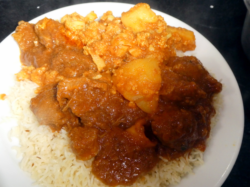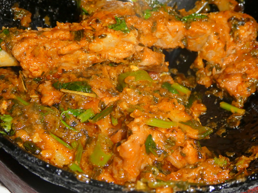 Ginger and Coriander had again been sprinkled on top, however, on closer examination there was so much more. For a moment I thought Dry Methi, maybe Onions, plus some Seeds. Beneath lay a delightfully Thick Masala, really – Thick. The Meat was in large pieces, counting felt unnecessary, Hector had more than enough food. I found two slivers of the dreaded – Green Mush. These were placed back in the karahi, no problem.